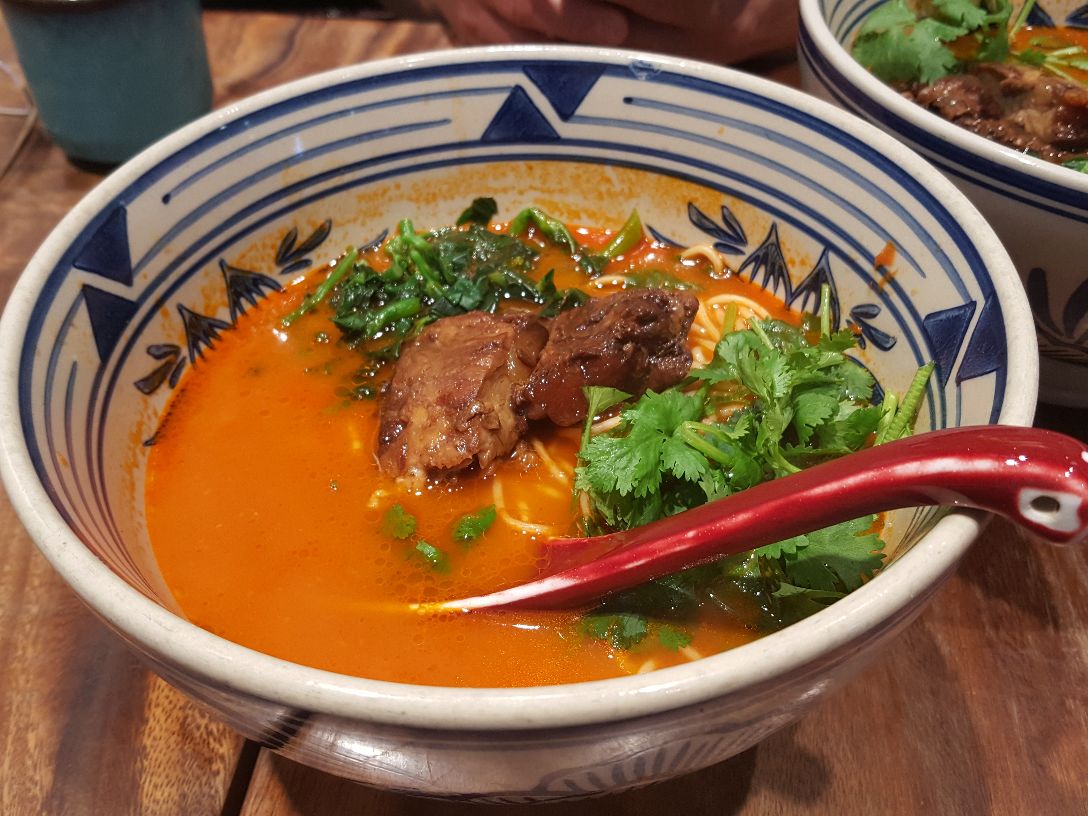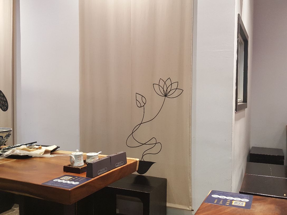 上海陕西路新会路路口的巴黎春天六楼,出电梯右转有一家“和府捞面”,这次点的是“香草番茄汤.猪软骨面”,感觉很好。现在柜台购买了就餐票,然后选座。仔细端详了这家捞面馆,一长溜的店面只在两头有稍大一些的餐厅,中间的餐桌几乎就是餐厅的深度,可是在这家捞面馆的精心布局之下,居然成为具有特别文化韵味的餐厅,这样的就餐环境令人赏心悦目。坐下喝了一会柠檬水,“香草番茄汤.猪软骨面”就上桌了,一只非常大的传统的海碗,里边是一碗温和不烫不冒热气的汤面,颜值很高,翠绿的香菜随意地漂浮在上,下面是一碗呈现着番茄红的浓汤,一捧软软的面条在汤水里时隐时现,加上汤水里两块硕大的猪软骨,极为诱人。稍稍把面条在汤水里搅拌一下,让汤水的味道更加充分地渗透到面条里,然后惬意地送入嘴里,面条柔软而不酥烂,汤水色浓味鲜,咬一口猪软骨,肥而不腻,口味适中,太好吃了!离开的时候再次看看这家捞面馆,忽然产生了一种朋友般的好感,下次再来尝尝其他味道的捞面吧。