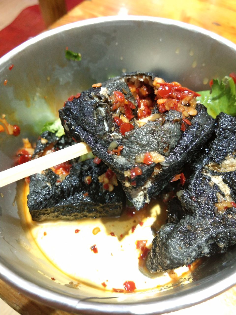 黑色经典臭豆腐店的套餐,一杯酸梅汁一根大香肠一份小份臭豆腐,二十多块。2016年来时臭豆腐5块钱4片的价格老早没有了,现在单买就是10块6片,罗家、文和友、黑色经典都是这样,臭豆腐还是很好吃的,炸好每片都会×一个洞,放辣椒香菜再浇卤水,这卤水估计每家秘制配方吧。