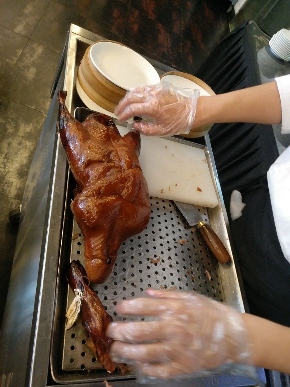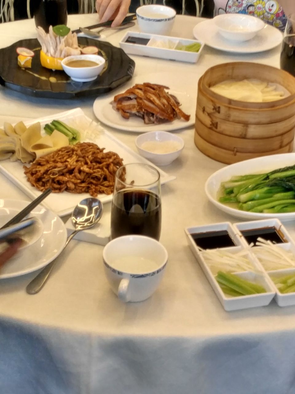 假期总归要来点大餐咯,这不是第一站就来到了全聚德淮海路店呢!中午生意也超好,大厅中间都是做片皮鸭的小推车,真不容易啊。 虽然现在魔都那么多做京帮烤鸭的,什么大董咯,京炉咯,但老上海人呢还是认准了全聚德老牌子。 不过说实话他家烤鸭的确有其独到之处,虽然现在有真空包装的就不说了。但现烤现片的非常好吃,尤其是鸭胸那部分的酥皮,酥嫩可口,蘸点糖,完美! 京酱肉丝有点咸口了,不过包饼还不错! 全聚德可不只有烤鸭哦,作为京帮菜老管子那么多年在魔都开的那么好,自然多了许多融合。 这不这道四喜烤麸做的就不比很多本帮馆子差哦。酱汁做的非常地道,木耳香菇吸收了酱汁甜而不腻。 紫薯山药泥,健康又美味的前菜。正好等烤鸭需要20分钟,来这样的2道冷菜既开胃又可以填填肚子,值得推荐哦!