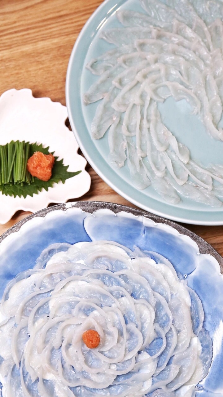 这家店有着国内为数不多的专业河豚料理团队,并有着自己的河豚鱼全产业链,各种证书也是挂满了墙壁。老板是个河豚迷,还为此专门写了本书叫做《河豚梦》,里面讲述了人们食用河豚的历史由来~ 制作刺身最适合的河豚就是他家用的虎豚,切片必须掌握好薄厚,口感是否到位和师傅的刀工息息相关。而且不同造型的摆盘,师傅还要用到不同的刀法。【河豚鱼生鱼片】是世界五大名菜之一,因为它片法考究,摆盘精美,在日本有着“白身鱼刺身之王”的美称。不同的造型有不同的名字:牡丹盛、鹤盛等~以此类推摆成什么样子就叫xx盛。