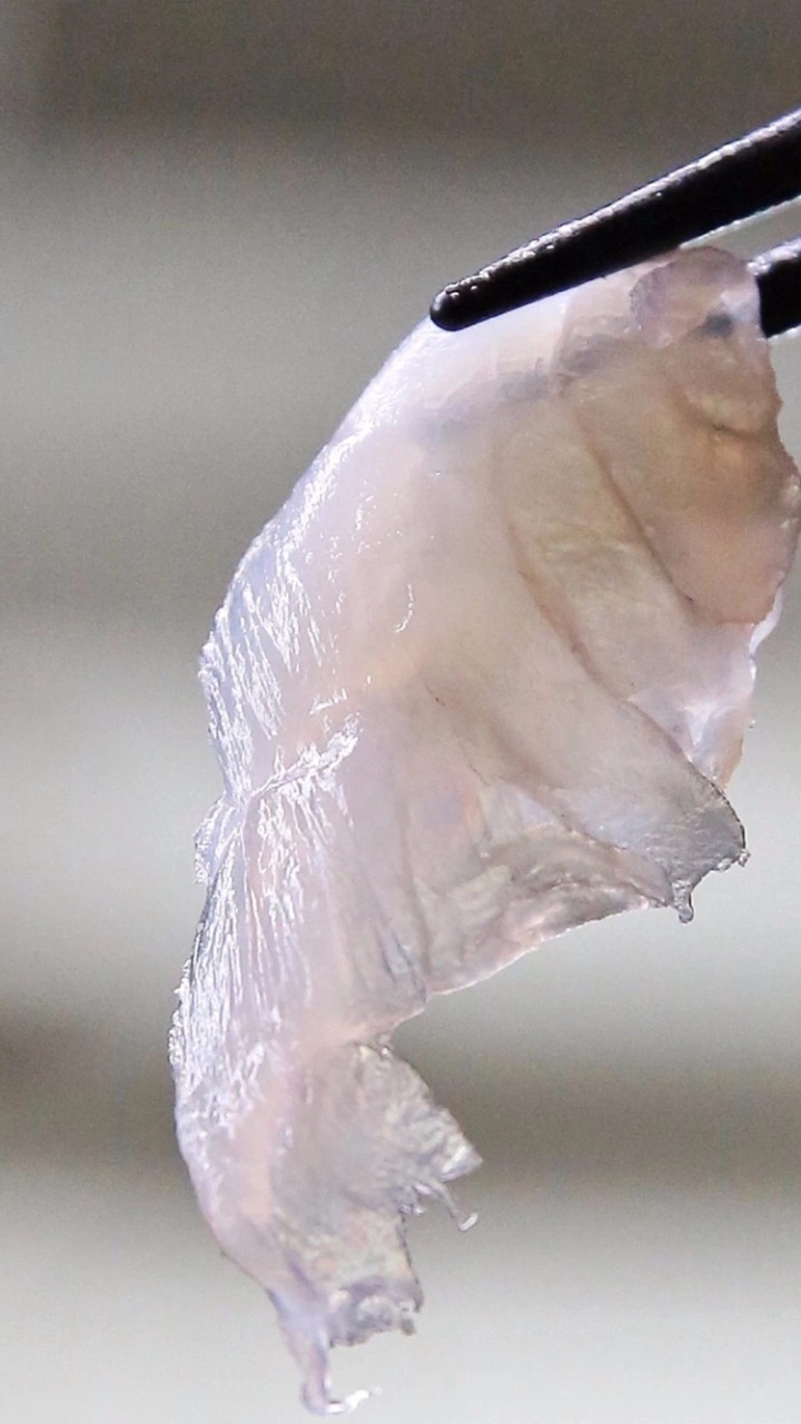 制作刺身最适合的河豚就是他家用的虎豚,切片必须掌握好薄厚,口感是否到位和师傅的刀工息息相关