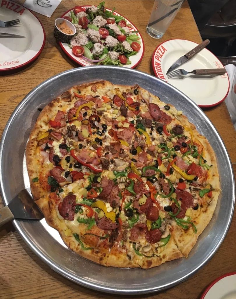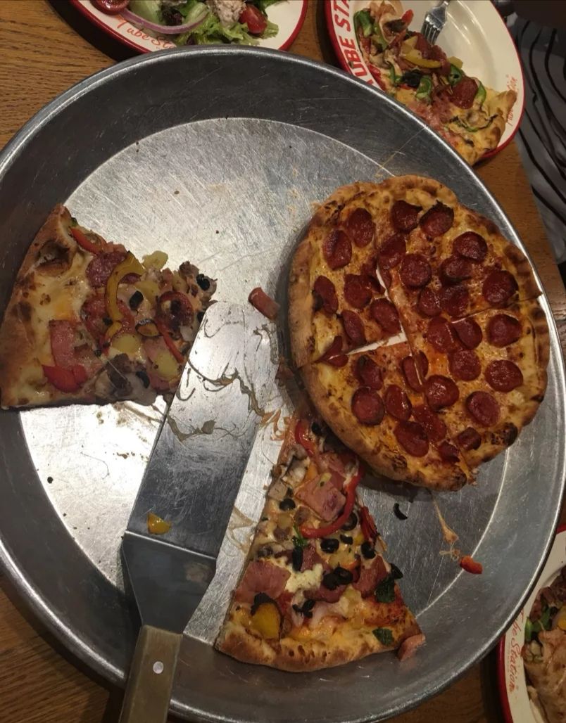 服务也不错。点了一个中号垃圾桶披萨和一个小号夏威夷,披萨可以双拼,中号的很大店面分两部分,里面有三张大桌子,每张桌子可以坐六七个人。点了一个中号垃圾桶披萨和一个小号夏威夷,披萨可以双拼,中号的很大。金枪鱼蔬菜萨拉料也很足,饮料都是瓶装果汁的味道。服务也不错。