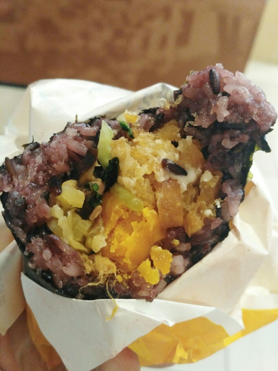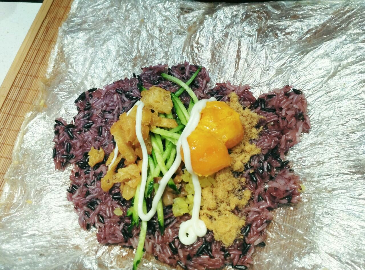 【芙蓉咸蛋黄饭团】这家饭团的米好好吃,长粒糯米软糯紧实有嚼劲,紫米香甜,馅料有肉松黄瓜榨菜两个咸蛋黄【芙蓉咸蛋黄饭团】这家饭团的米好好吃,长粒糯米软糯紧实有嚼劲,紫米香甜,馅料有肉松黄瓜榨菜两个咸蛋黄。蛋黄加热过,包裹的海苔很脆。
