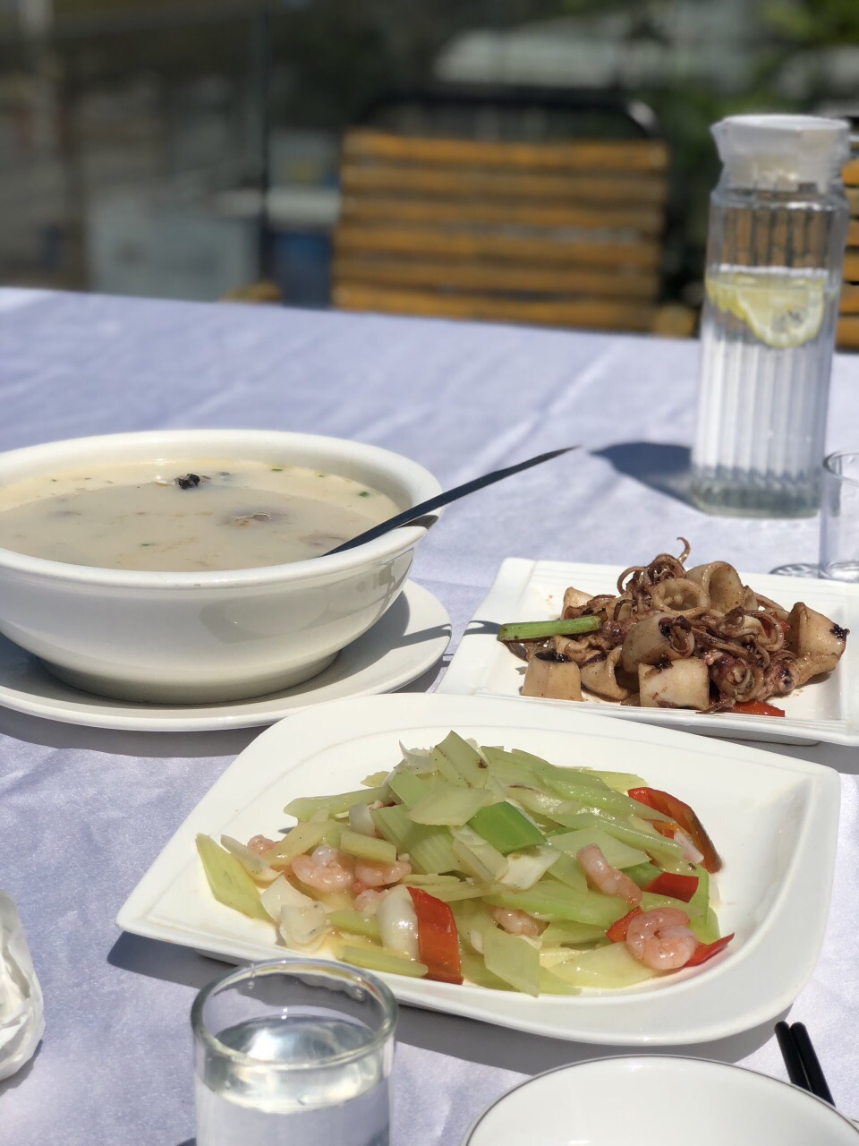 外琨塔海岸酒店音乐餐吧 中午到的时候不觉得是音乐餐厅,但是到了晚上就明白其中的含义了 楼下音乐喧嚣震天,特别high 餐厅是酒店里面的,我们因为住在这个酒店,实在不想走了,就在这个酒店吃了午饭 位置:海景大道北部湾一号东侧 坐在这里吃饭可以看到下面的海景,虽然这里的沙滩并不是很好看,但是能在2月底看到如此海滩很开心了。 酒店有非常优惠的4人套餐,我们3个人吃的非常饱 本来太阳还不是很猛烈的 但是等我们坐下来以后,太阳就越来越猛烈了 所以还是要选择有太阳伞的地方吃饭 或者在室内吃也是可以的,但看不到室外美丽的风景了 鱼肉豆腐汤,真心觉得很大过哦,鱼腥味还好,不是很重,能接受,豆腐很大块 鱿鱼筒,煮的不老,嚼劲很好,不错不错 沙姜牛肉,这里的份量真的很多,和我们平时吃的大盘子小分量不一样,牛肉很嫩 百合云耳炒西芹,里面还有虾仁,西芹可以多吃点,据说是瘦腿的哦 还有一份炒时蔬,这么多真心是吃不完 中午吃饭的人不多,价格真心很实惠,酒店很赞
