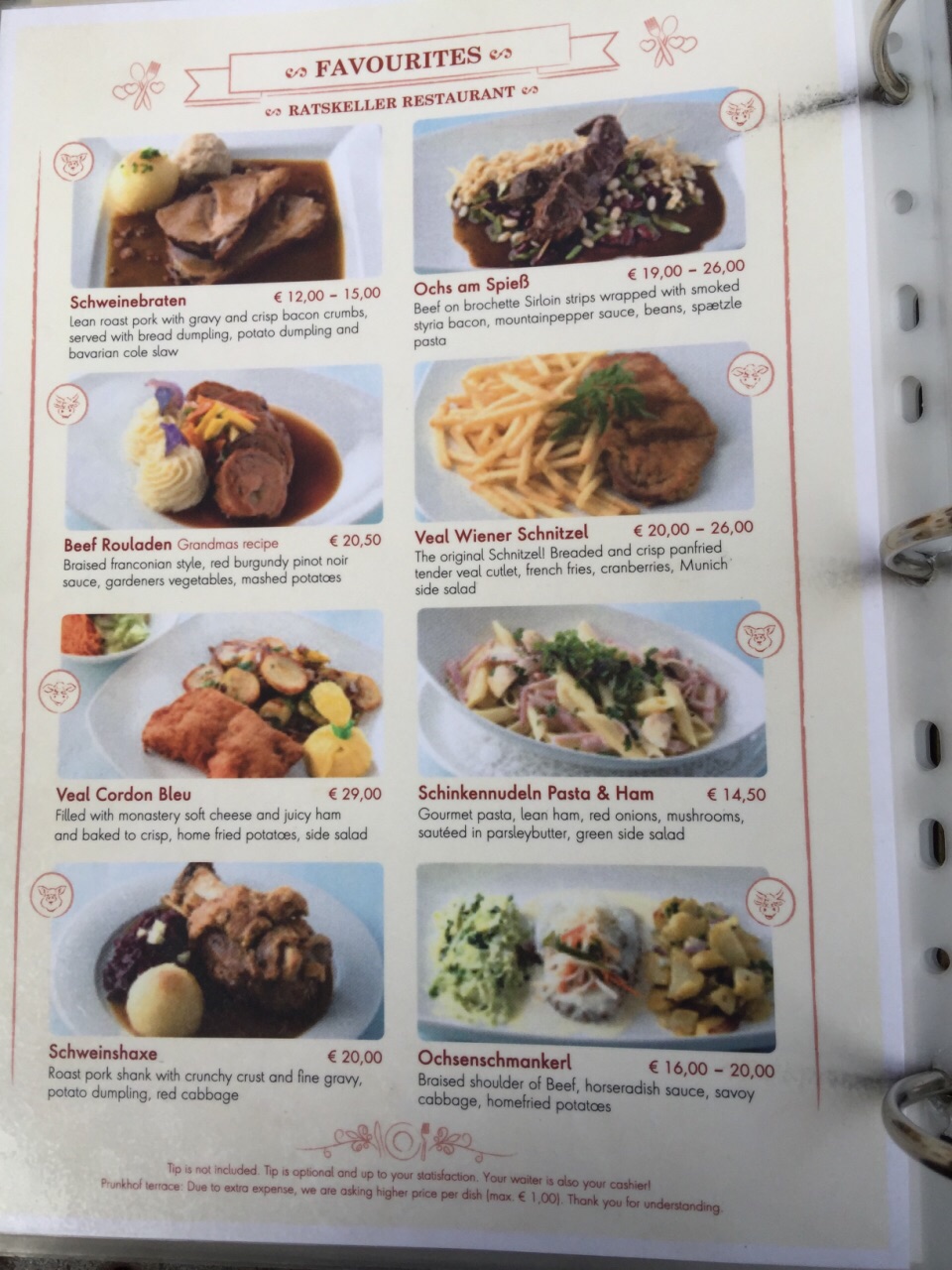 游客成堆的地方的餐厅就不能指望太好吃啦。这家开在地下一楼,楼上门面虽不起眼,地下却有1200多个位子,各种大小包厢,圆台,吧台,四人雅座等应有尽有,环境雅致,基本上就是个吃氛围的店。味道跟德国乡下小镇的比差了很多,量也不大,价格更是德国小镇的翻倍还不止。没啥服务,还死皮赖脸的问你要小费。跟德国小镇味美量大朴实的餐厅真是没得比。我点的那堆菜里最难吃的就是南瓜汤,完全没有南瓜味,估计就是盐加水加南瓜粉冲出来的。通常德国餐厅的南瓜汤都有面包送,这家抠的连面包都没有。我点的那堆菜里,最好吃的是巧克力慕斯蛋糕,实实在在的是巧克力慕斯,比另外一个黑森林蛋糕好吃。黑森林蛋糕有点酸的,主要是放的腌制水果酸的。题外话,这家店开在地下,所以没网。唯一比别家好的地方是菜单有图,点菜方便许多,这在德国还真难得。