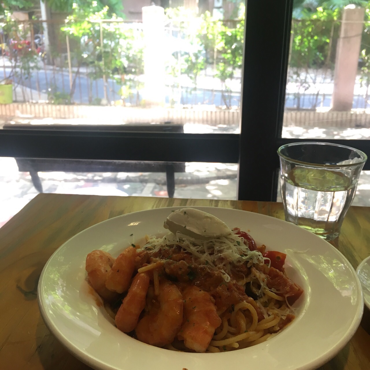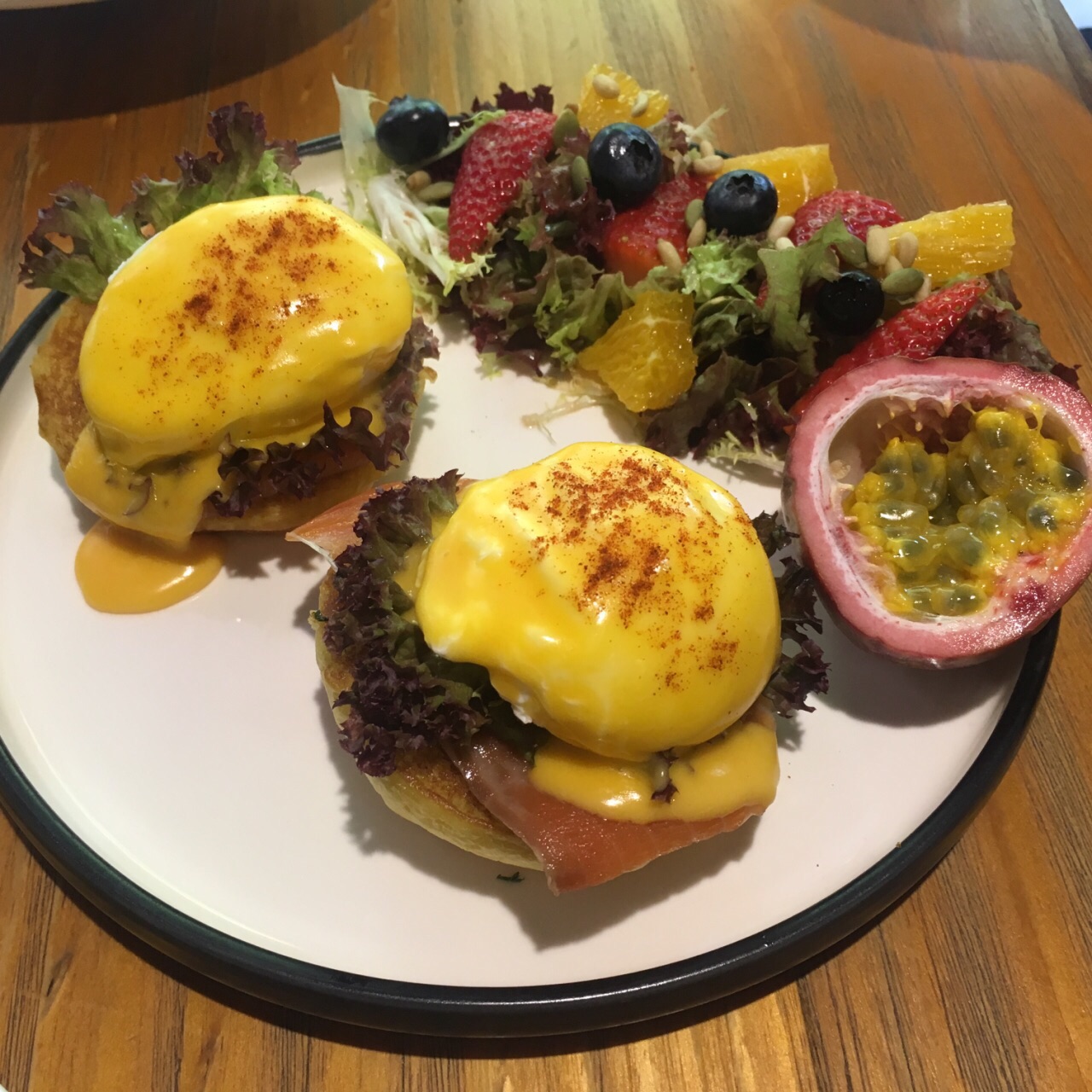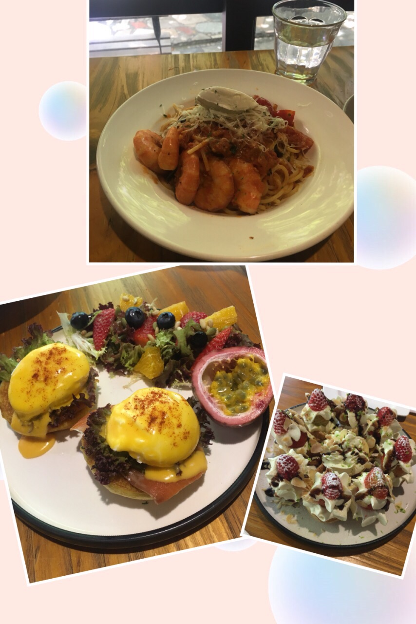 这家CAFÉ是我特意找来与朋友周末相聚的地方。主要是因为看榜单说推荐排名前几。地方不是很大,交通还算方便。里面桌子只有十桌左右。选了靠最里面的两人位坐三个人就为了对着外面的“后花园”。食物份量比较精致,不像外面的早午餐系列,一份够两人个女生吃,一份早午餐份量仅够一人。我们两个还点了一份意粉。味道可以一百份。最后朋友来了加了个华夫饼。不过不失。论环境聊天这里很适合,但仅限人少的时候。人多坐靠近吧台的地方就挺吵的了。