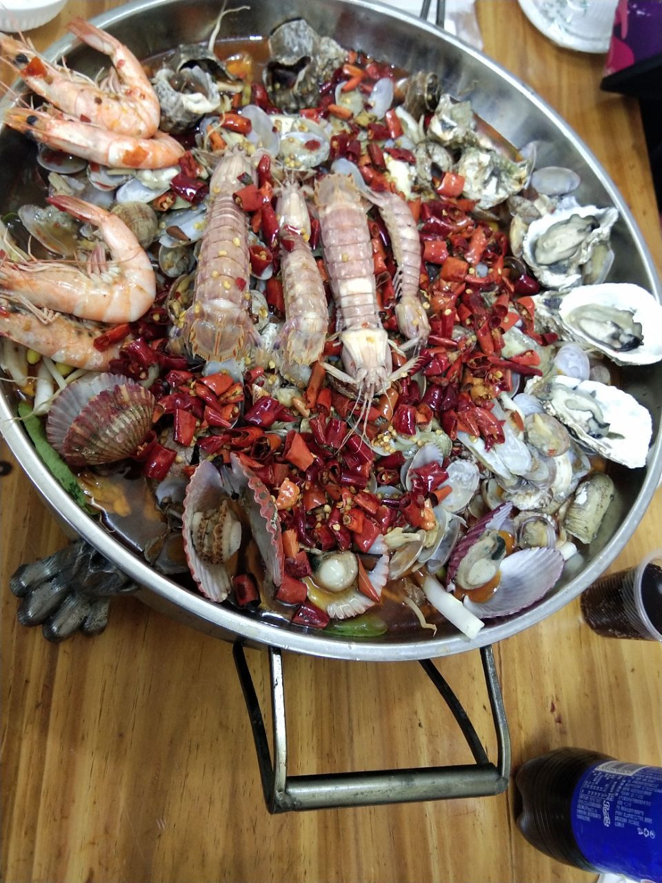 比前一天八宝乐便宜30块,不过八宝乐都是海鲜,这里海鲜量会少一些,底下垫有蔬菜,有皮皮虾、海螺...
