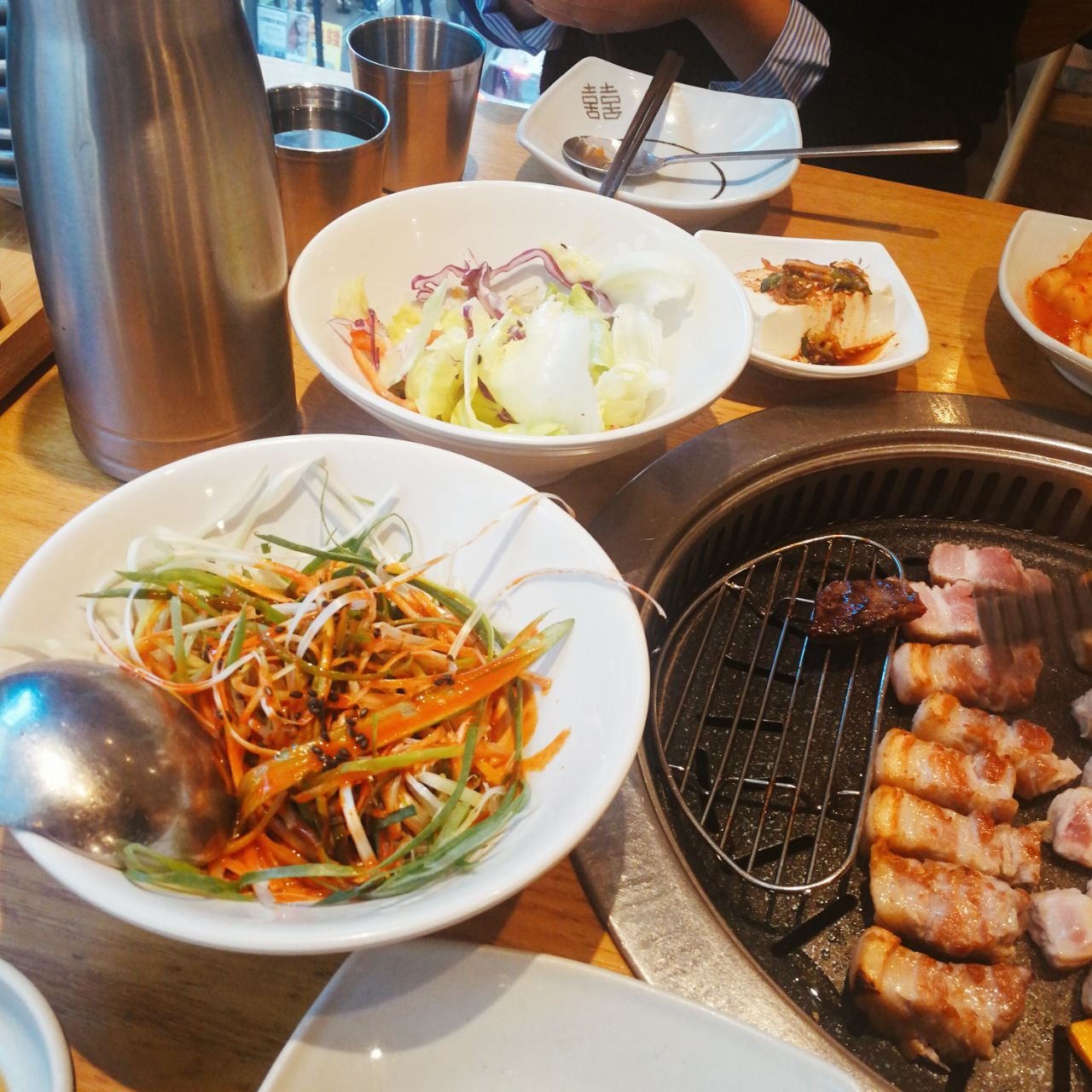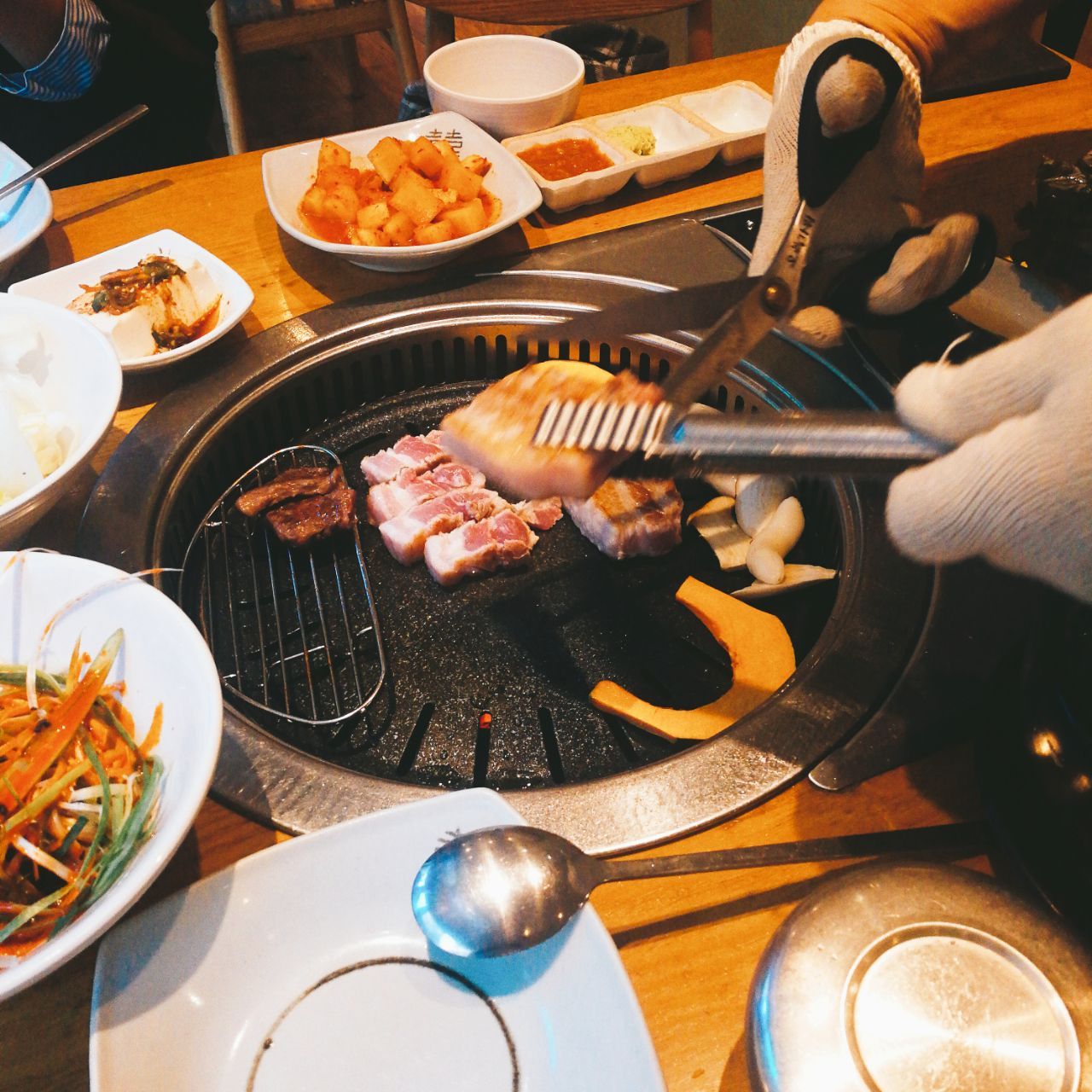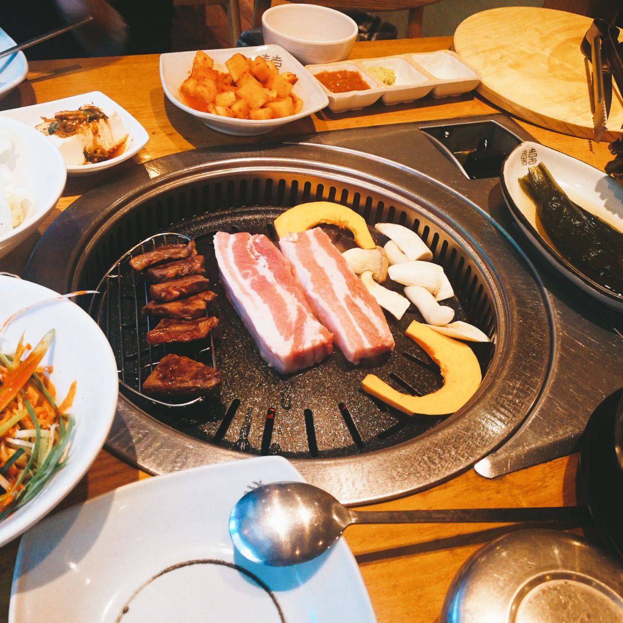 分量足,肉很新鲜很厚,腌制的肉特别好吃。不用自己动手,服务员大叔会帮我们,特别省心。小菜配了一桌子,很良心。有包间,有靠窗的座位,位置也很宽敞。推荐烤五花肉,牛腩,牛骨汤。我们两个人吃了四百多,虽然有点小贵,但是人家肉特别好,在韩牛里面算是很便宜很便宜的了。必须五星!!!