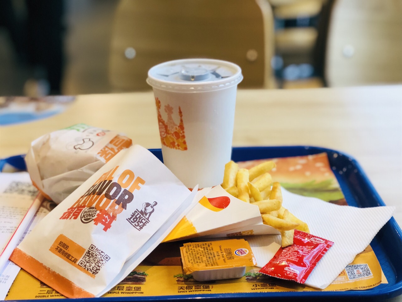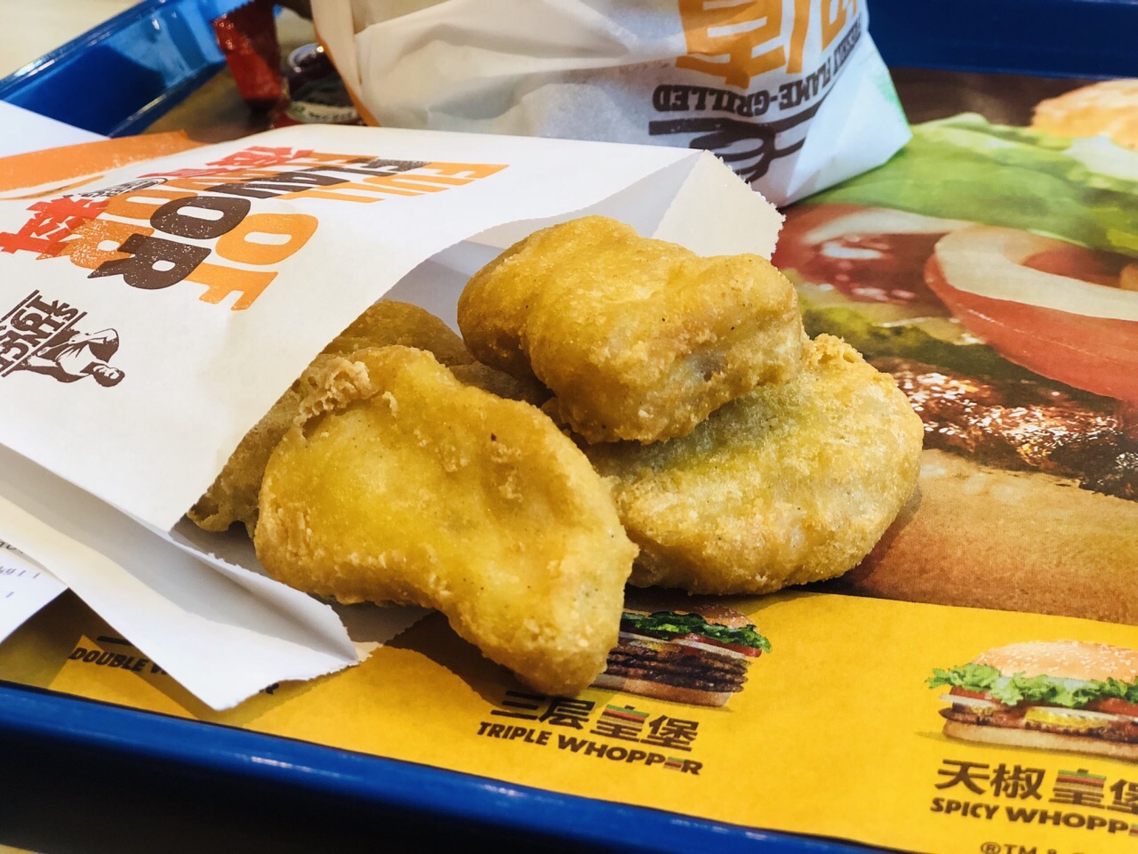 汉堡王 快餐类,我最爱的是老爷爷 但是小伙伴不喜欢,每次都会制止我去吃 奈何 看到了汉堡王,想到我为了有饲料然后在口碑买了24元4件套的汉堡王套餐 那今天就把他用了吧,不要像之前买的套餐一样过期了,太浪费 地址:天一广场药行街,HM后面,如果你要去城隍庙,那穿越酷购商城就能看到汉堡王了。 环境:一楼是点单和制作食物的地方,二楼是餐桌,地方还是很大的。 24元4件套,量太大了,一个双层汉堡、一份中号可乐,一份薯条,一份鸡块,我没吃完,整个汉堡都没吃,要打包带走了,明天的早饭吧… 其实薯条还是蛮好吃的,胖胖的薯条还不错,鸡块也是肉肉十足,不错不错,搭配可乐吃起来别提有多爽了。 总价24元不过口碑还可以减5块,所以这个性价比很高。