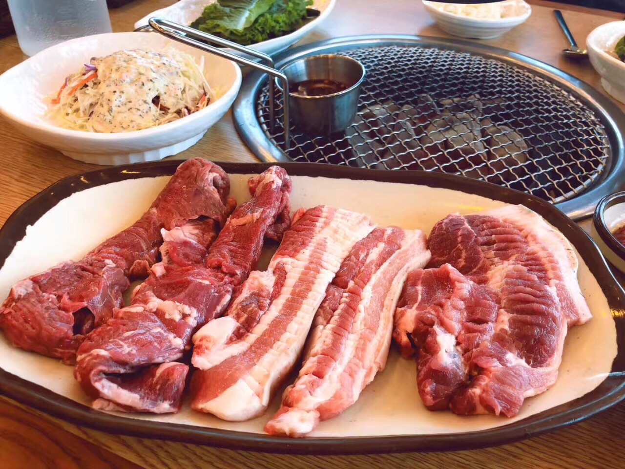 将肉在火上烤到8分熟,再用生菜叶包着辣椒、蒜、酱和烤熟的肉一起吃,口感超棒 烤黑猪肉也太好吃了将肉在火上烤到8分熟,再用生菜叶包着辣椒、蒜、酱和烤熟的肉一起吃,口感超棒 烤黑猪肉也太好吃了!连泡菜鱼饼腌蟹腌菠菜沙拉这些小菜都一扫光