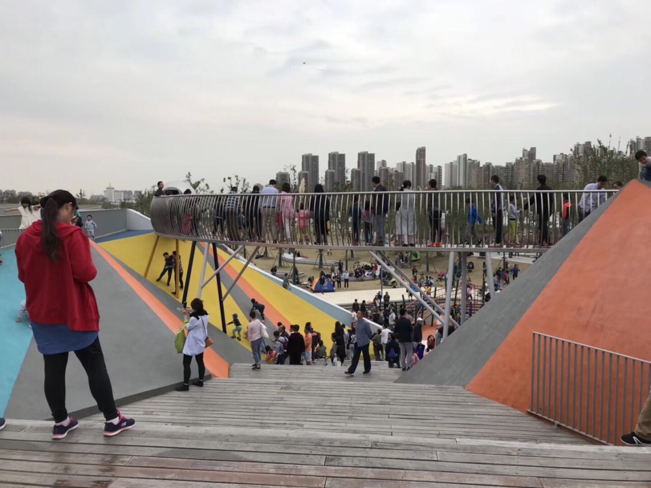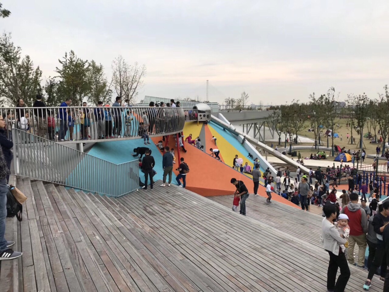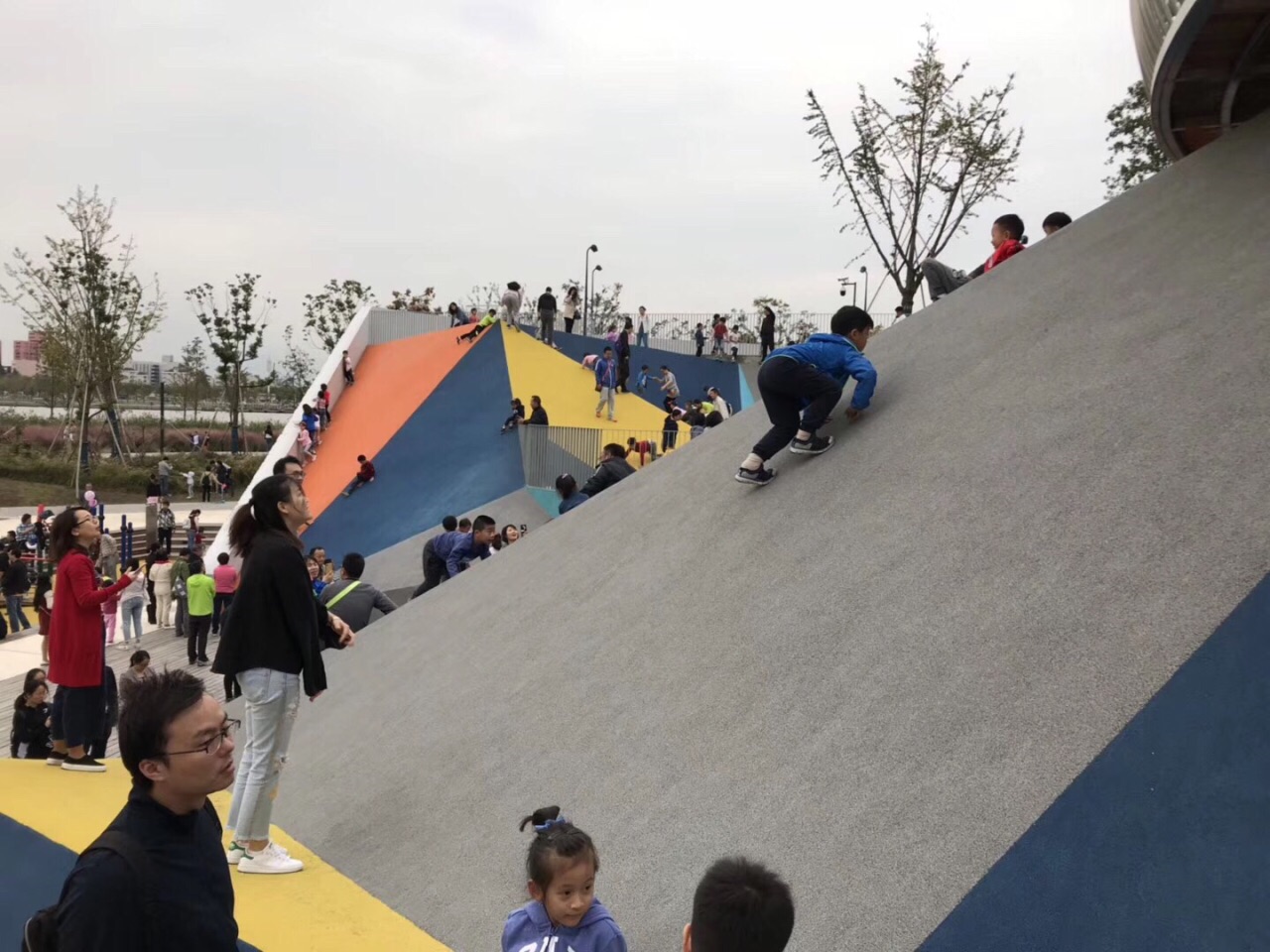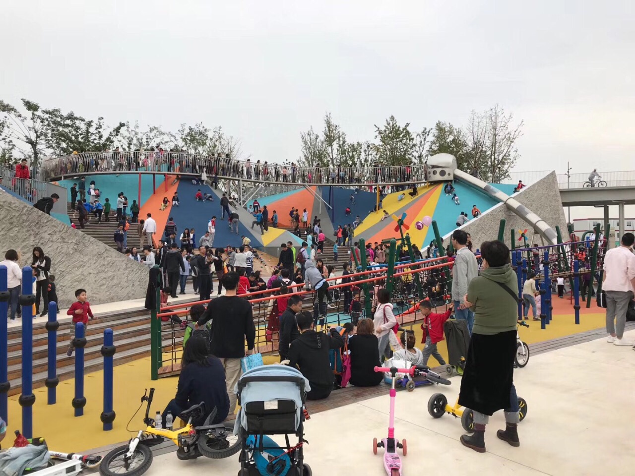 打卡一下最近上海最红的前滩室外游乐场[微笑]不大的一片场地,做的比较丰富有趣。接近人山人海了[偷笑]感觉最主要的是增加了游乐难度,不在是乏味的滑不下去了滑梯[调皮]有一点危险性和刺激性,小朋友们都很嗨。[微笑]没有保护措施,家长们似乎也都挺淡定[偷笑]