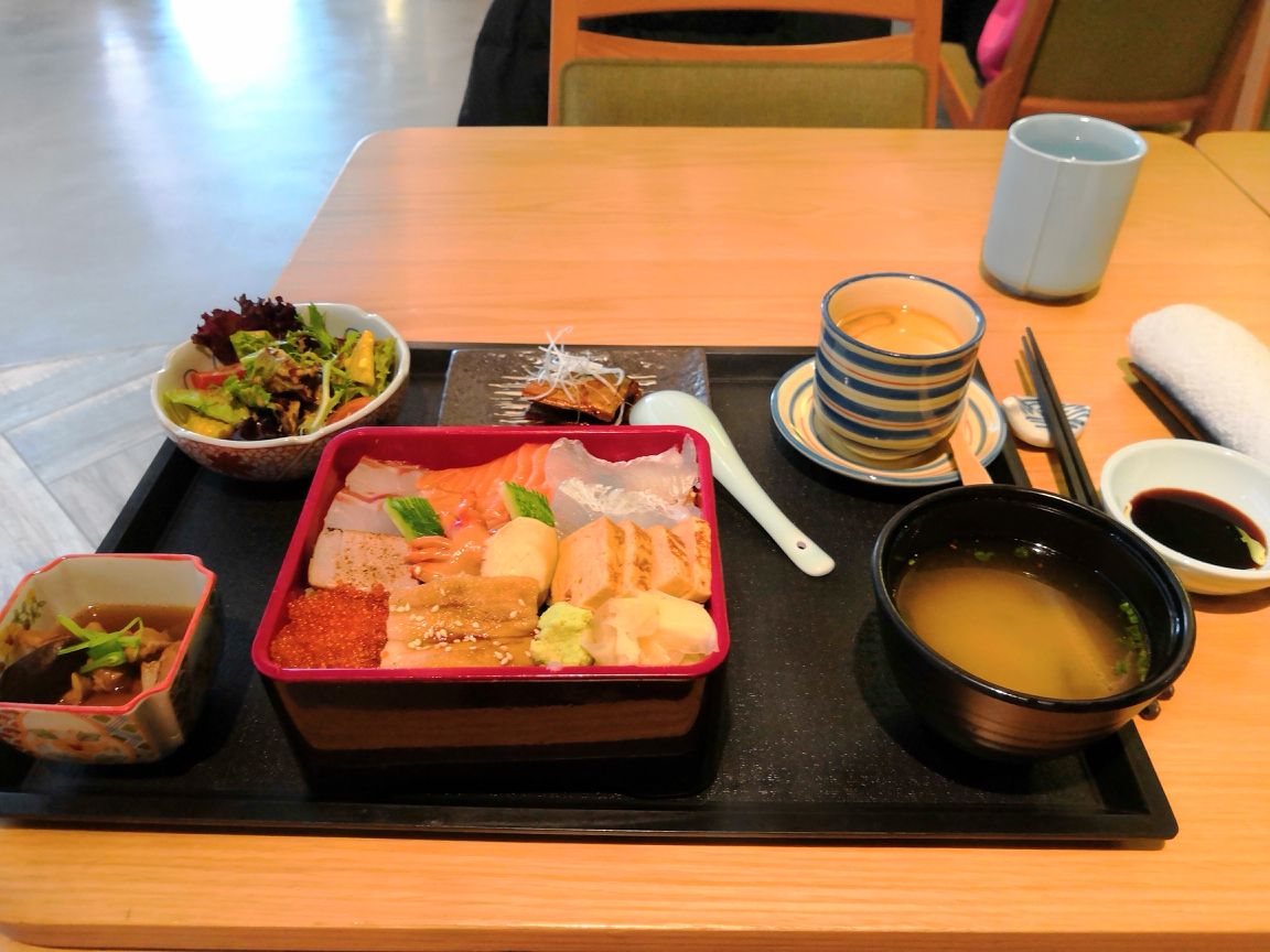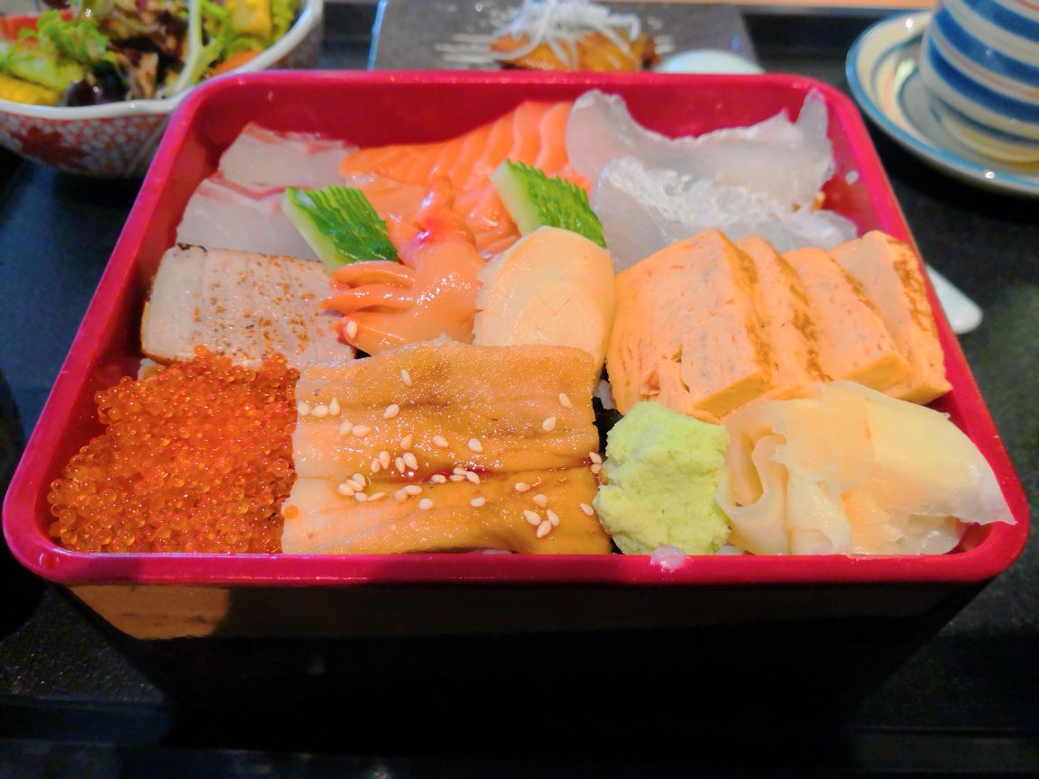 点了海鲜饭定食:海鲜饭有鳗鱼、三文鱼、鲷鱼、鱼籽等,很新鲜,姜片很好吃,芥末看颜色像现磨的。茶碗蒸里放了银杏果,而且鸡蛋蒸的比其它店里的嫩滑,味增汤里放了豆腐和蘑菇,其它小菜都很精致。寿司品种很多,下次尝尝鹅肝寿司。现在点评可以送意大利奶冻。