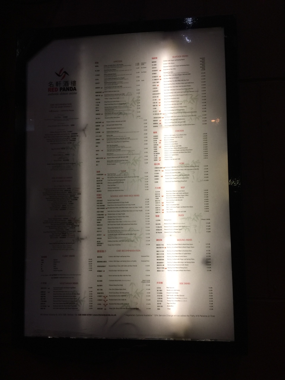 国外吃晚饭的规矩还真多,尤其是那些所谓华侨开的中餐馆。去早了,没开门,没饭吃。去晚了,对不起,厨房已下班,明日请早,还是没饭吃。没预定,诺大的店,鬼都没一个,照样拒之门外没饭吃。看看门上的菜单和价钱,以及网上的评论,算了,没缘,不吃也罢。贝尔法斯特这么多中餐馆,干嘛非吃这家?话说贝尔法斯特的中餐馆的中英文名字还都真有趣。这家英文叫red panda,中文直译是红熊猫,但这家的招牌上中文名写的是名轩酒楼。这中文和英文也不知道怎么连上的?