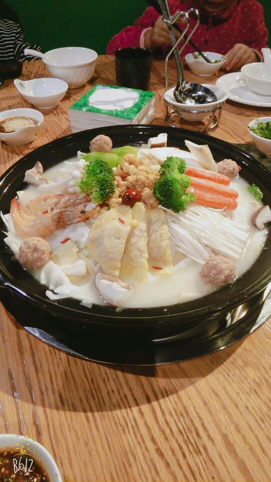 点一个锅底就可以了,里面什么菜都有,喜欢吃其他的再点些菜,这个虾滑蛋非常好吃,新鲜又美味!现在的技术也越来越先进了,手机二维码扫一扫就开始点菜了,非常的方便,不用排队!里面的调料非常多,喜欢吃什么口味的自己配,我这个配的有沙茶酱,海鲜酱,辣油,麻油,芝麻,香菜,味道十足!