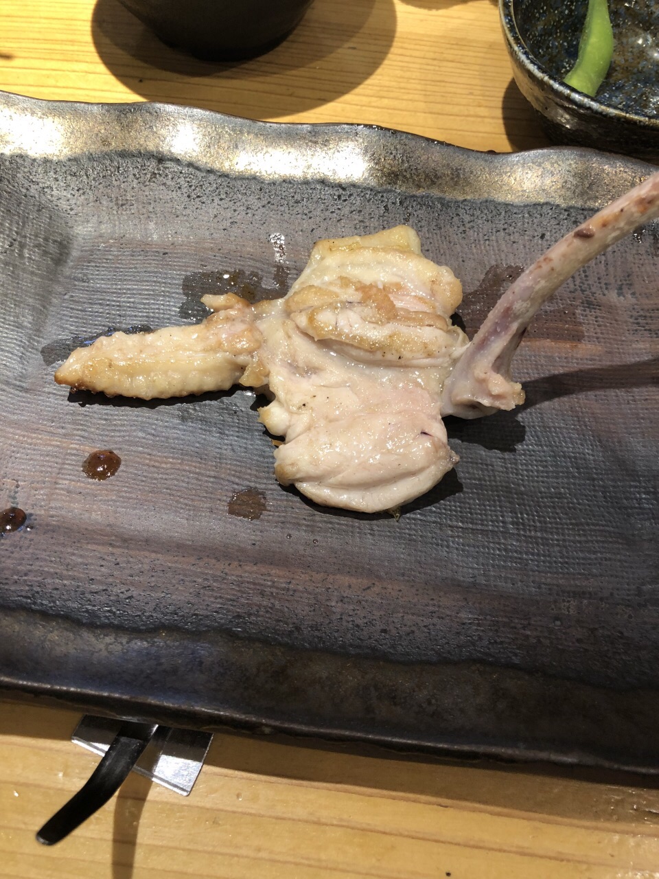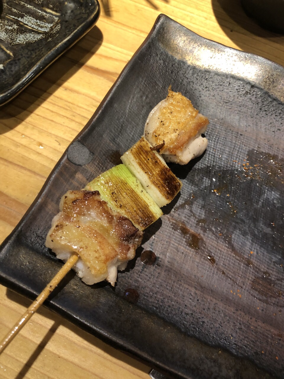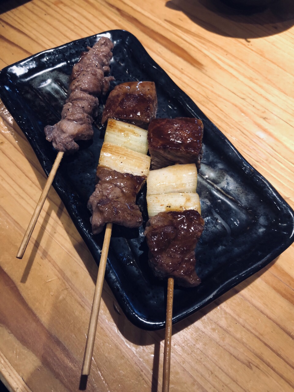 在大阪市内的最后一餐,想着日本行还有烤串没吃过,然后就看到了这家店,天意如此,那就进去了。 进去看了下菜单之后,发现可并不便宜。差不多一串是200日元,而且那一串的份量真的是很感人的。 点的串都还不错,少油,很健康。 最棒的就是翅中,烤得很棒,很漂亮,而且就一面是焦的。处理得很好,就留了一根方便拿的骨头,其他就是肉,很赞。 柚子梅油不错。 就是等的时间有点点久,没事过来吃还可以。