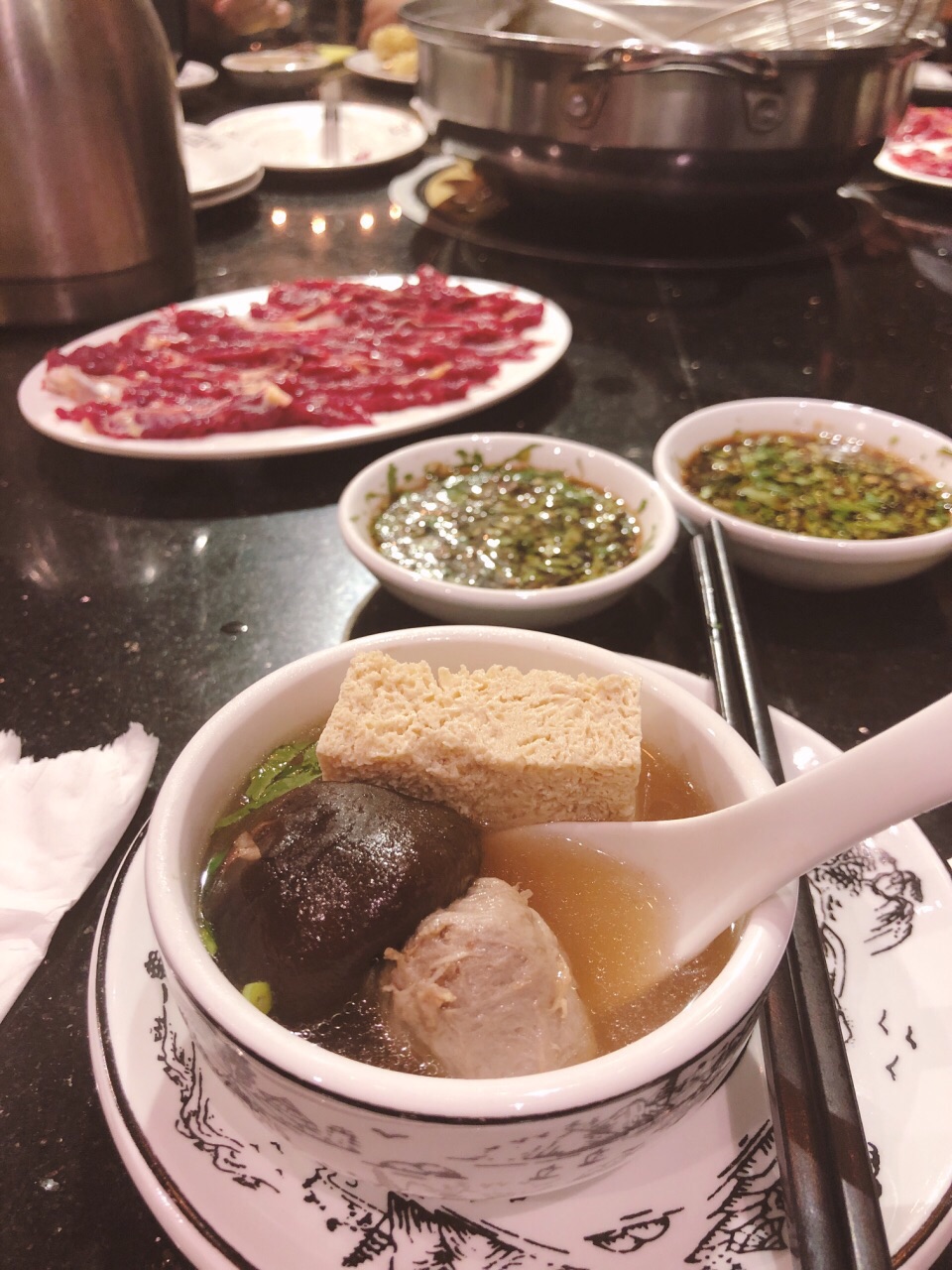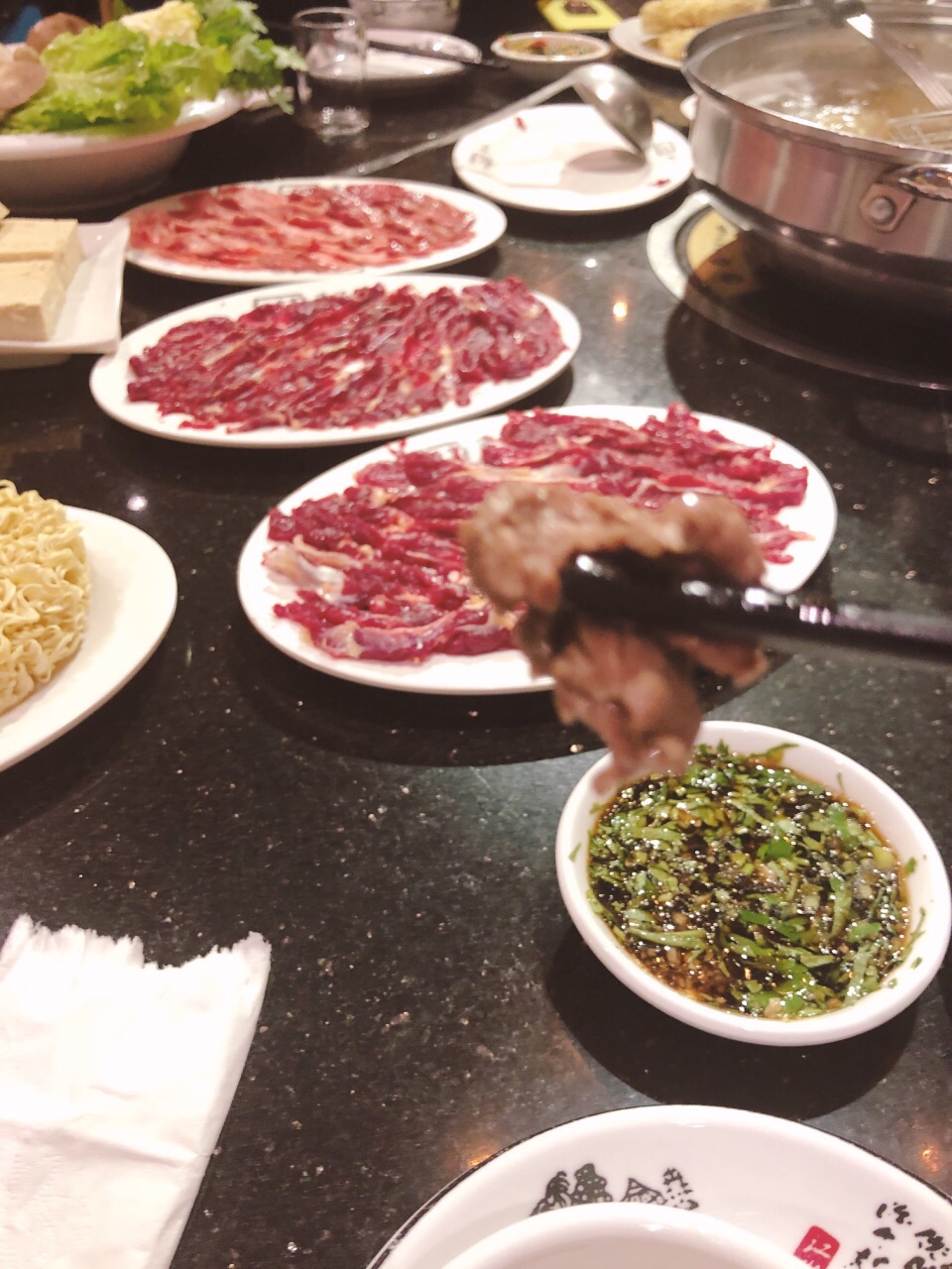 这家八合里是厦门的第一家八合里店,算是总店了~~ 在嘉禾路上,农业银行的旁边。 生意非常好,之前路过好几次都是大排长队,这次终于有机会过来一试。 选的萝卜汤底,在把几种经典的牛肉都点进去,小伙伴说这次来刚好看到还有牛舌,赶紧也点进去了,后面一吃,真的不错。 还选了一些蔬菜,面食,自助酱料那边还可以,常见的几种芝麻酱,辣椒,蒜蓉,姜丝,芹菜等等也有。 最主要的还是牛肉好吃,性价比不错~~