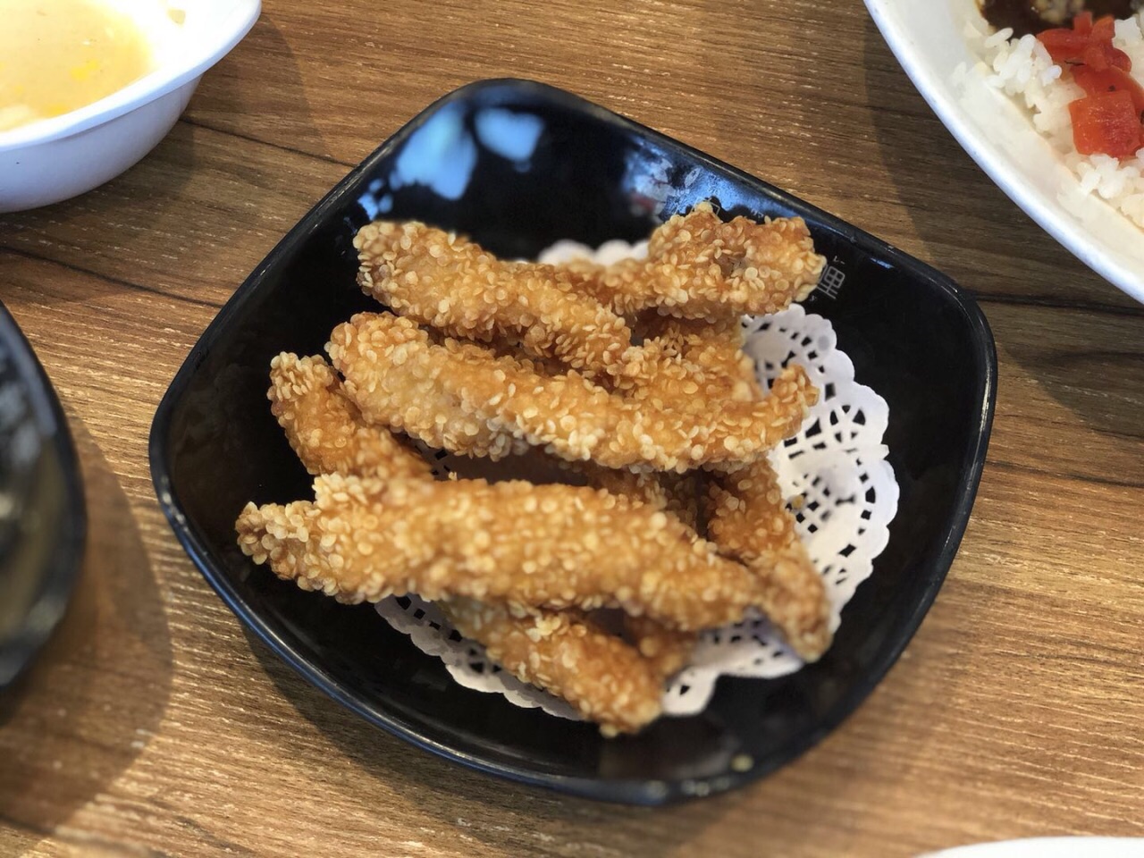雪花无骨鸡柳,量虽不大两人食也刚刚好!微辣,鸡柳外皮脆脆的,肉质很香嫩,赞! 胡麻酱豆腐,酱味有点日式沙拉酱的味道,让普通的豆腐也变得很好吃 香香浓浓的粟米汤,这个天喝一碗热浓汤真的是超幸福的事了,暖胃又暖心哦!