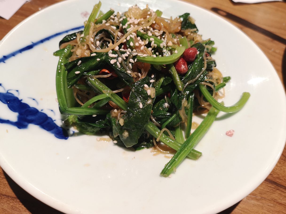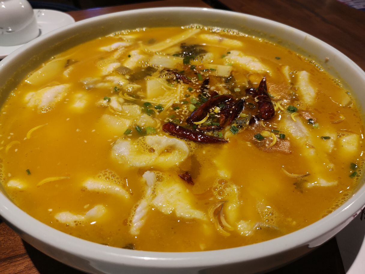 工作日午餐时间过来,食客并不很多,餐厅面积足够大,餐位随意选。入座后,一扎酸梅汤上来,酸酸甜甜,满开胃的。 金汤醉鲈鱼,满满一盆,是的,蛮大的一盆,酸菜,笋片,金针菇,略略有点臭臭的味道,足够咸、足够辣,必须搭配米饭。鱼肉很鲜嫩,切片,只有鱼肉,鱼头鱼尾都已去除,鱼刺比较少。 #小白爱小绿#,小白就是鱼豆腐,小绿就是青菜,比较清淡的一道菜,个人偏爱里面的大蒜头,软糯软糯的。 #果仁粉丝菠菜#,菠菜、粉丝、花生米儿,干辣椒,芝麻粒儿,浇油,略咸。