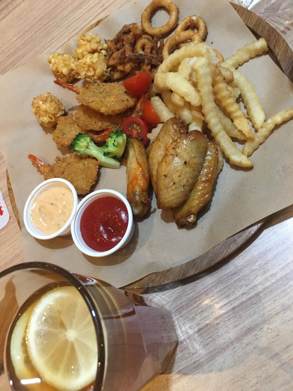 ...规中矩 不过有一股味道 小食东西还挺多 鸡翅虾饼薯条和虾球应该是 饮料两杯水果茶 总体一般般吧