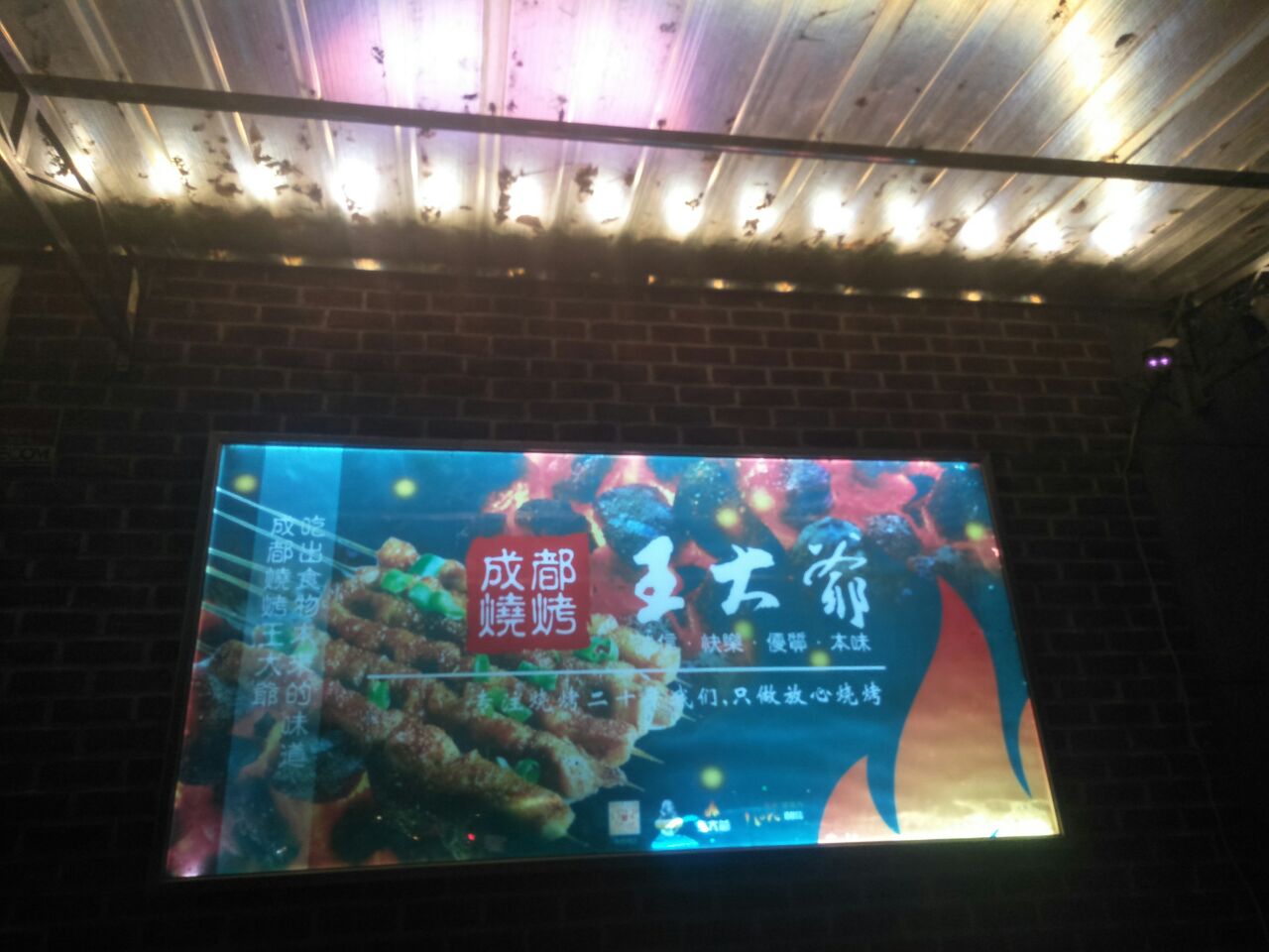 朋友请吃烧烤,带大家来到王大爷总店,听说这家的烧烤挺好吃的。这儿外面里面都能坐,里面还有小雅间,我们人有点多就坐的大厅,刚好还能看电视。王大爷的名字很接地气,它的装修又很有风格,座位都比较宽敞,坐起不挤,整个店看起都干净卫生,没有印象中烧烤店的油腻脏乱。我们点的有烤串、烤鱼、生蚝、酱爆豆腐等。不论是烤的素菜还是荤菜,味料和菜的烤熟度都刚刚好,吃起来非常香;烤鱼和豆腐的感觉是鲜香麻辣、很有食欲。特别推荐一下五花肉、大排和鸡脖,这是我第一次吃烧烤吃那么大的整根排骨,不同于小排骨,大排肉多汁香更加入味。店员们都很热情周到,有什么需求马上就过来帮忙。这次的聚餐很巴适,感谢朋友的款待,下次的烧烤再约!