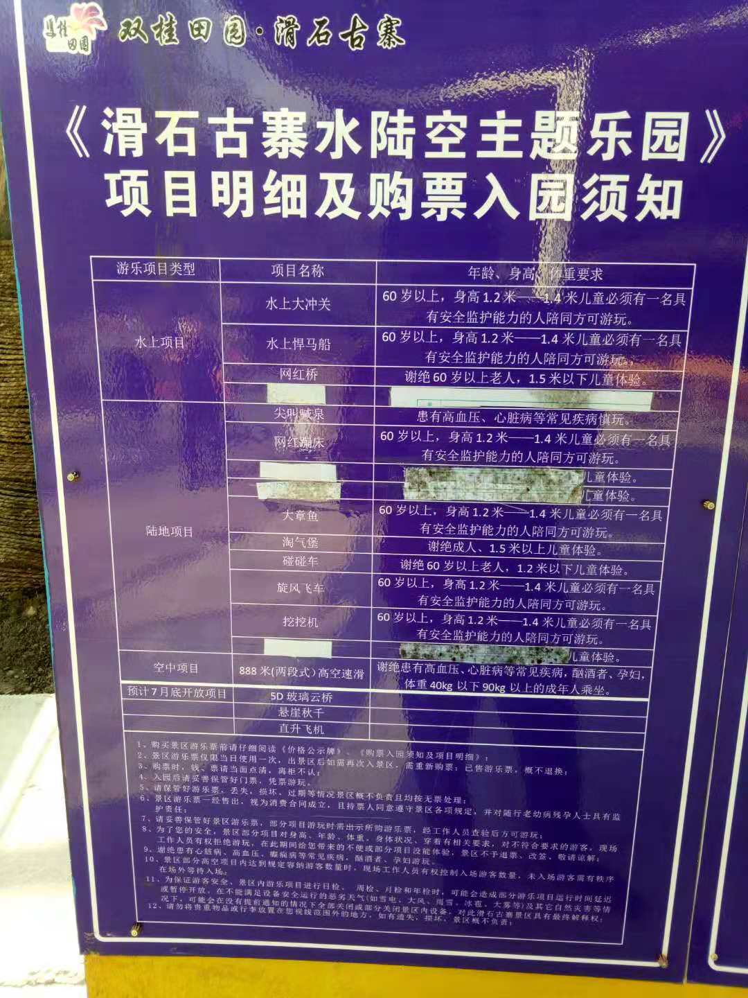 只适合小孩玩耍,还有就是很多项目没有,而且诸多限制,1、攀岩项目,项目介绍上面没有写明要求,问工作人员说小孩也可以,就一直排队等,但排队到时,换了工作人员就不可以了,打景区投诉电话也没用,说是小孩没有自理能力,不能参加此项目。为什么不写一个明显的告知书呢。(明显就是人说了算);2、出景区要走半个小时左右到停车厂(工作人员说只要10多分钟,明显不可能);3、碰碰车一点力都没有,开一下停一下。(明显是工作人员搞的鬼);4、只收钱不管安全,在高空速滑项目时,我提醒工作人员安全锁没有锁上,工作人员却说没事,无视安全;5、水上悍马船项目时,非要5个人才可以(人不够要等到人够才可以),而且只允许在水上15分钟,超时另外付钱;6、购票时说山上有吃饭的,比较便宜15元/份,可真实的是25元/份。7、套票价格98元+玻璃桥40元=138元,总体算下来,不值(很多项目没有或因限制不能参加)。
