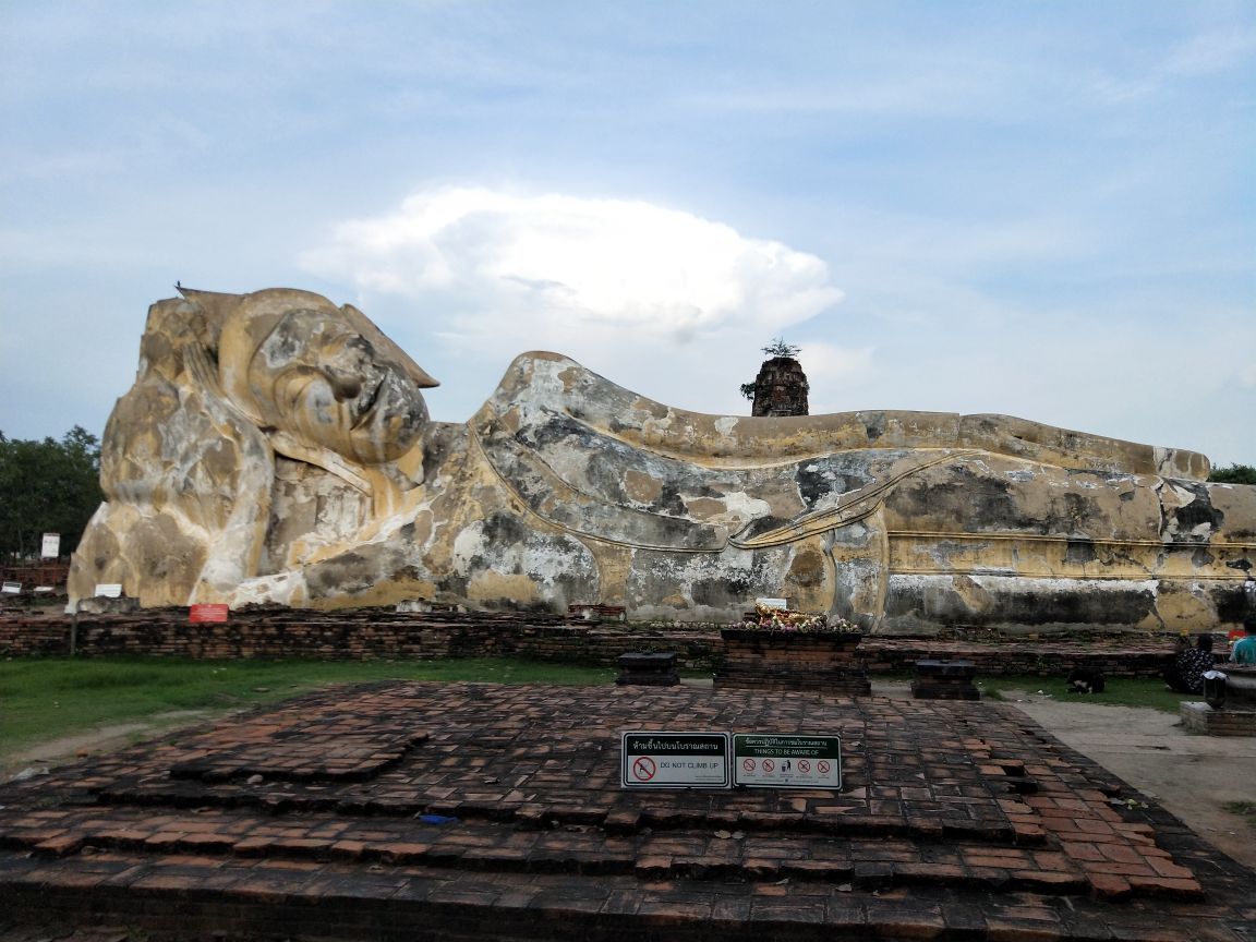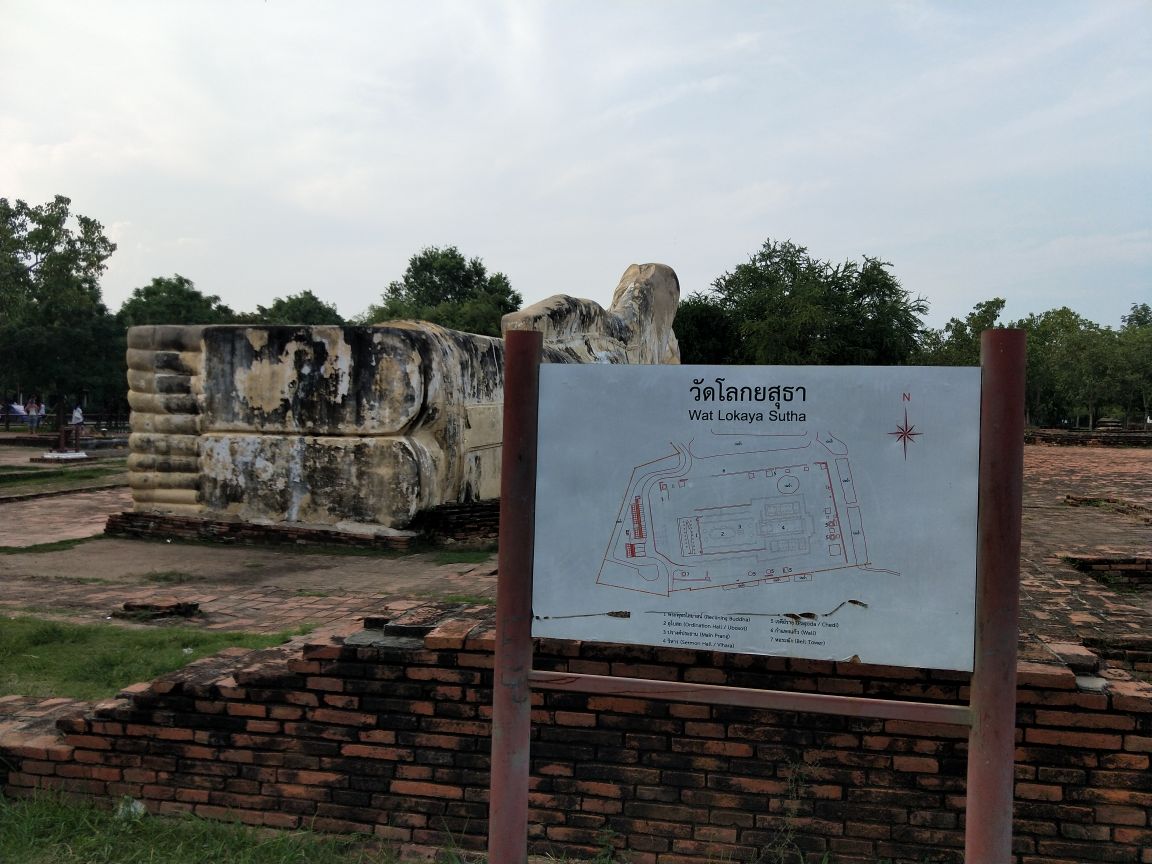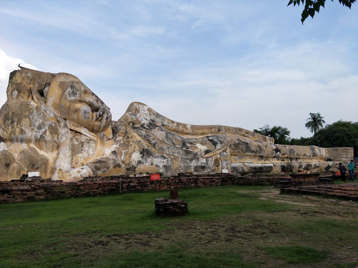 【大城卧佛寺】 大城的卧佛事其实名称是叫做罗卡雅苏塔寺,位于古城内的西北方向。 这个寺庙在故宫的后方,靠近沃兰彻寺,可以从古代宫殿的后方到达途经沃辣鹏寺和沃拉它姆寺。 最大的特色就是市院里面有一个大型的卧佛,由砖石造的,跟很多卧佛的材质不一样,包裹着石膏,大约是有42米长在佛像附近,可以看见很多大店的六角支柱,可以想象得到,原本这座卧佛是一座相当大的寺院,有外建筑包围着的,不过因为这个都呈日渐衰落,又年久失修,所以现在有点破败了。 不过,就单单看这尊卧佛就已经是十分值得过来了,毕竟他是佛国泰国全国的第二大卧佛,第一大估计是在曼谷的卧佛寺里面,不过这次去曼谷也没有特意去卧佛寺一趟,挺可惜的。 【周边配套】 这个虽然是一个寺院,但是其实现在这里除了大佛之外,其他地方基本上都只剩下一些地基,还有支柱,所以是免费进入的,只需要开车过来附近停下来,步行过去就好了。 有洗手间在附近,但是是要给5泰铢的。 要拍到卧佛的船警要走到另外一方,因为正前方经常都有很多人的。