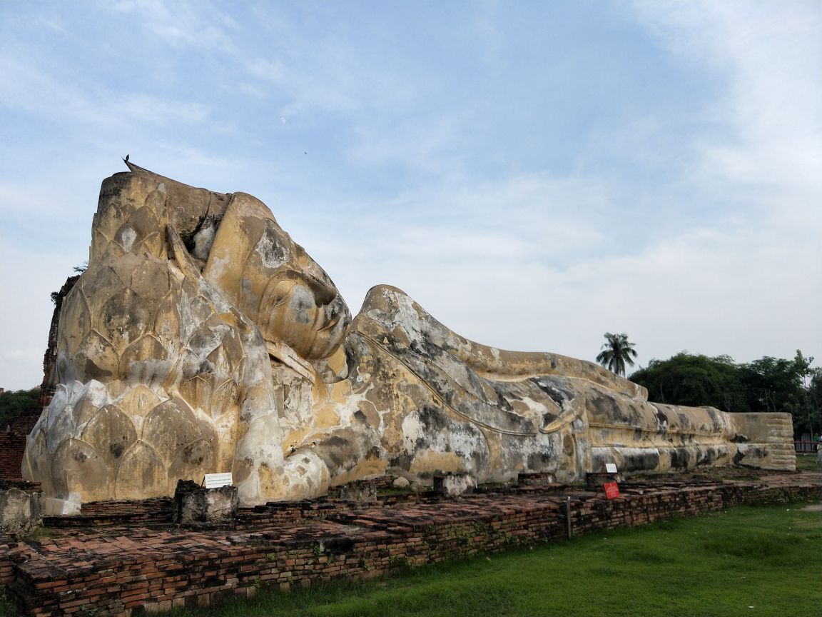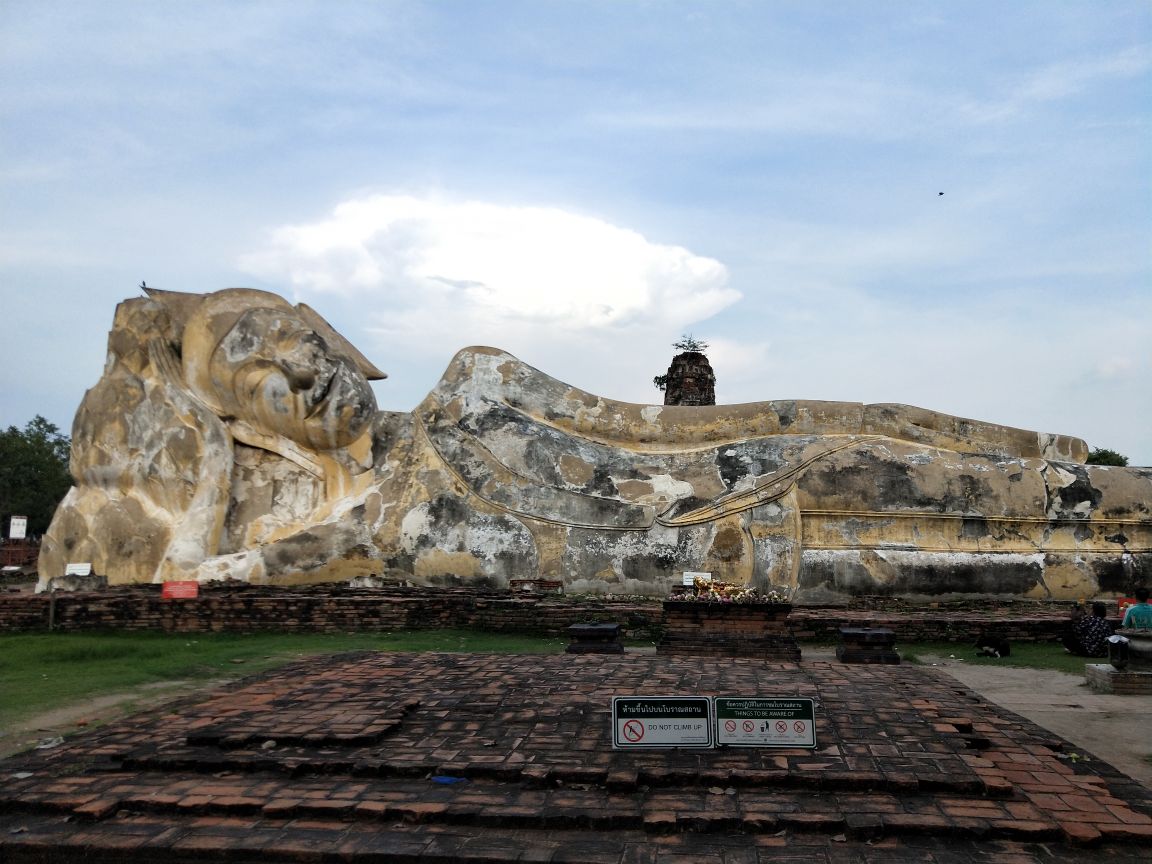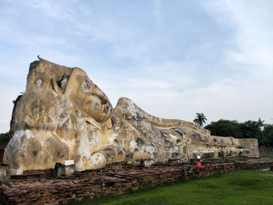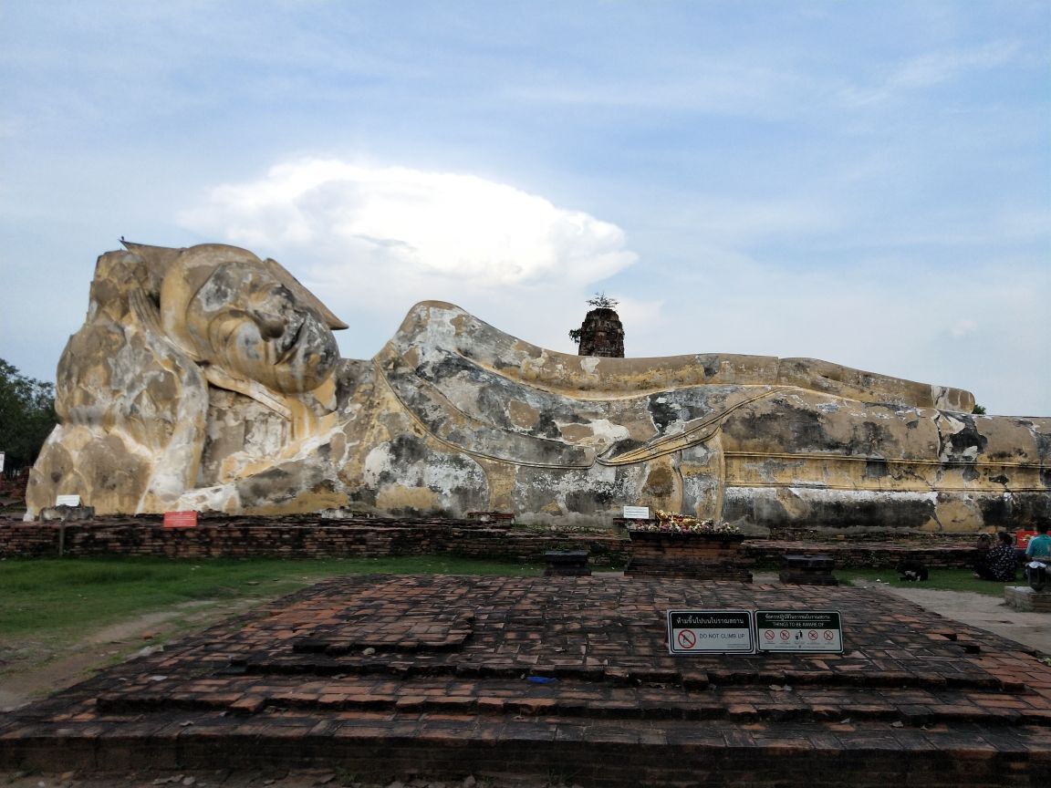 【大城卧佛寺】 大城的卧佛事其实名称是叫做罗卡雅苏塔寺,位于古城内的西北方向。 这个寺庙在故宫的后方,靠近沃兰彻寺,可以从古代宫殿的后方到达途经沃辣鹏寺和沃拉它姆寺。 最大的特色就是市院里面有一个大型的卧佛,由砖石造的,跟很多卧佛的材质不一样,包裹着石膏,大约是有42米长在佛像附近,可以看见很多大店的六角支柱,可以想象得到,原本这座卧佛是一座相当大的寺院,有外建筑包围着的,不过因为这个都呈日渐衰落,又年久失修,所以现在有点破败了。 不过,就单单看这尊卧佛就已经是十分值得过来了,毕竟他是佛国泰国全国的第二大卧佛,第一大估计是在曼谷的卧佛寺里面,不过这次去曼谷也没有特意去卧佛寺一趟,挺可惜的。 【周边配套】 这个虽然是一个寺院,但是其实现在这里除了大佛之外,其他地方基本上都只剩下一些地基,还有支柱,所以是免费进入的,只需要开车过来附近停下来,步行过去就好了。 有洗手间在附近,但是是要给5泰铢的。 要拍到卧佛的船警要走到另外一方,因为正前方经常都有很多人的。