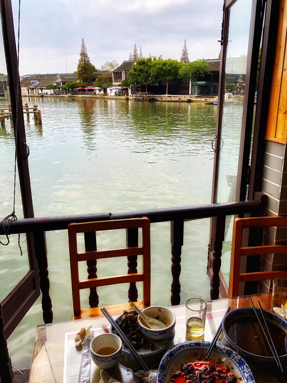 天好就去朱家角走走,中午11点过一点,这家餐厅正好就在面前,就去解决午饭。从门口进去,先是一个院子,再往里走才是餐厅,有两层,但还不到吃饭高峰时间,人很少,我们就坐在楼下靠河的位置,风景不错。因为肚子不饿,所以就没点大鱼大肉的硬菜,虽然菜上齐后觉得看上去好素,不过这样吃肠胃没负担,挺好。点单前先上了一盆花生,还有大麦茶,爸妈说“长生果”很好吃,但我不爱吃,就一个也没碰。点的菜有酱爆螺蛳、蚌肉豆腐、青菜面筋、鱼香茄子、菌菇肉丝,味道中规中矩吧,没觉得有哪个特别好吃的。店家服务还不错,螺狮端上来发现有辣椒,说了一下,没想到就拿去重炒了,其实我们真的只是说一下而已。老板中途也会过来问吃得怎样,我爸倒也是直言不讳,说菌菇肉丝太咸了……本来还点了个银鱼羹,后来觉得蚌肉豆腐已经很像汤类了,就去问问可不可以不要了,也很爽快地给退了。结账用了团购券,饭费总共也就100来块,简简单单吃一顿还是蛮实惠的。