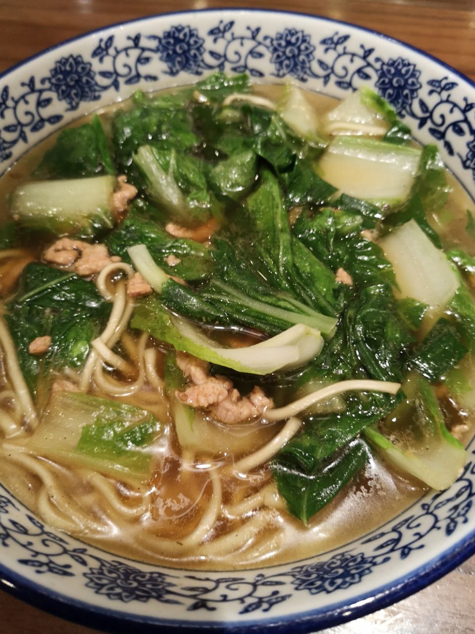 面条是满满一大碗,飘着浓郁的香味,青菜绿油油,肉丝味道新鲜,面条蛮有劲道,汤底鲜美无比