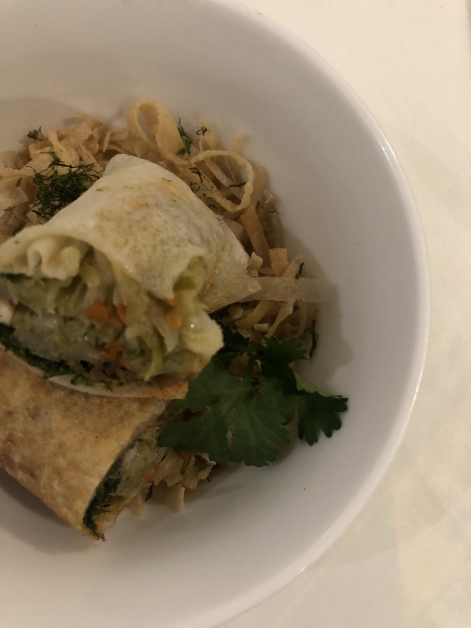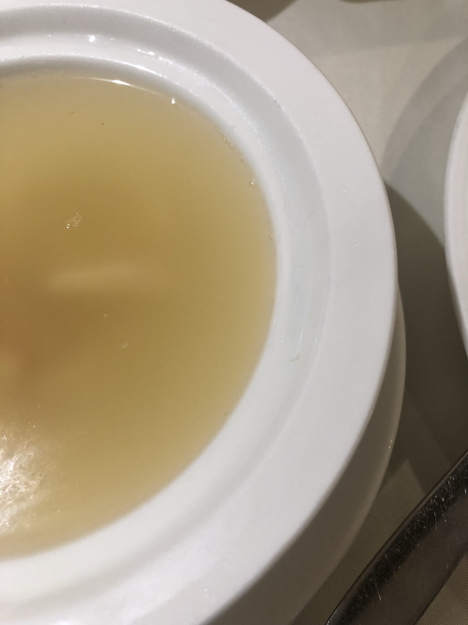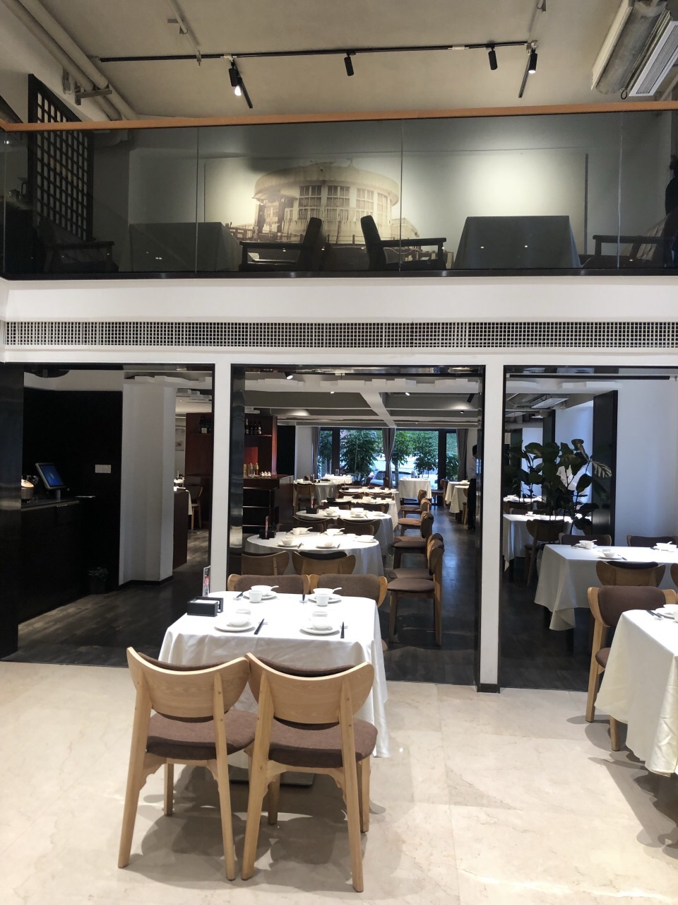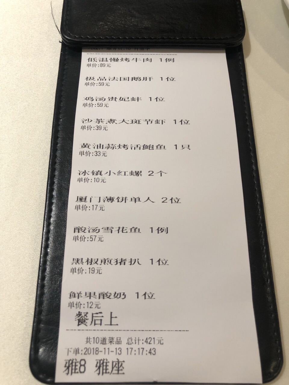餐厅门口的路旁可以停车,不过车位不多,餐厅旁边的金源大厦和斜对面的禹洲广场都有比较多的停车位。餐厅的下午营业时间5点开始,中午开到2:30。室外院子有位置,不过今天室外风比较大,坐室内。餐厅灯光明亮,乳白色的大理石地板看起来很清爽干净。餐厅前台为长条形一体的桌子,背景为黑色组合板以及咖啡和调教台一体,看起来简单大气。餐厅分为上下两层,半敞开的双层格局显得空间比较大,不过二楼楼层不高。来的时候还有10分钟才营业,坐在一旁等待,工作人员还在做最后的准备,不过等候过程中没有提供饮用水,写点评的时候已经5:02,没有人过来领我去座位,这一点有待提高。这下好了,刚刚说二楼会压抑,我就被安排到了二楼,其实还好,可能我没有一米八……iPad点餐,不过系统设计有点问题,选择了就变成下单,我以为直接厨房那边就收到了,赶紧叫工作人员询问,其实点了下单不是真的下单,得改进一下。点了10个菜,厦门薄饼还得两份起点,很是难过,都想吃,又怕吃不完。接下来说菜色。厦门薄饼作为特色菜,单人份必须两份起点,分为油炸和非油炸两部分,非油炸的一半口味一般,不推荐,油炸的口感酥脆,可以尝试,一个人去的朋友可以只点一份,和服务员说,你的那一份都油炸就好了(我不清楚,点了两份,上菜后恍然大悟)。鸡汤贵妃蚌推荐,贵妃蚌非常滑嫩,鸡汤清淡爽口,可惜这是比较前面上的菜,建议可以后上。鹅肝大推荐,选用的鹅肝肥厚,外焦里嫩,搭配的烤沙梨也火候恰到好处,十分解腻。黄油蒜烤活鲍鱼不推荐,都是高温后黄油独特的焦香味和蒜味,丝毫吃不出鲍鱼本身的味道。黑椒煎猪扒,沙茶煮大斑节虾和低温慢烤牛肉都中规中矩,牛肉上面的粗盐太过粗大,冷不丁咬到容易吓到。冰镇小红螺一点不小,非常好吃。酸汤雪花鱼,汤酸微辣,鱼嫩滑爽口,可惜鱼无味,不推荐。