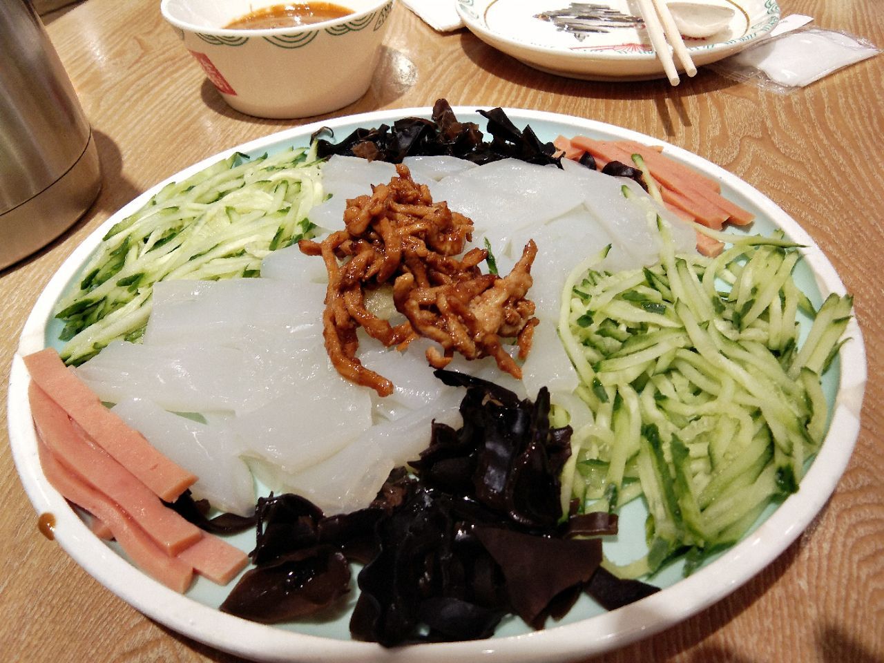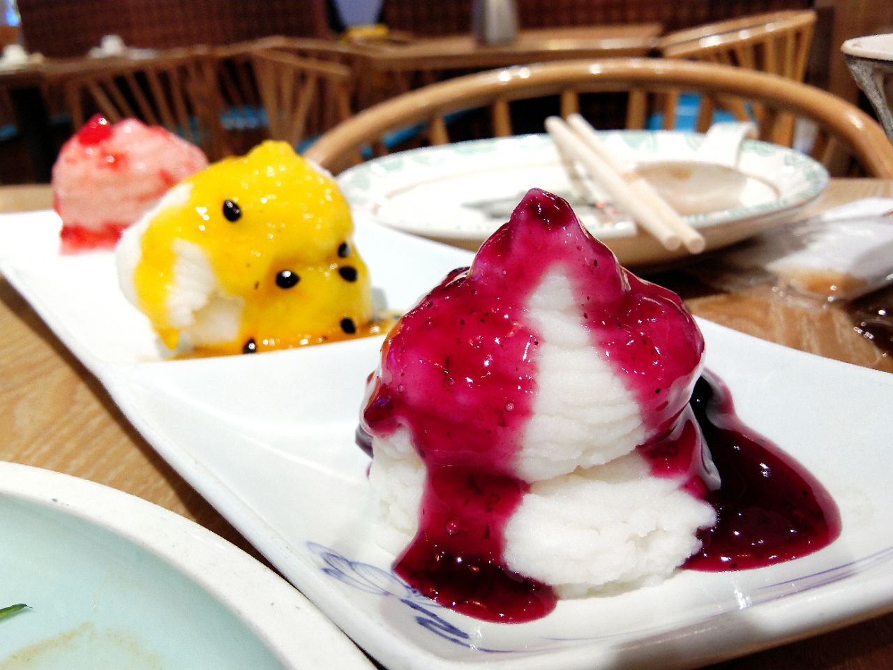 崂山金鼎利群六楼,有五六年没去过了,竟然金鼎也开了分店,服务提高好多,处处跟得上,还很贴心哦! 跟着吃的霸王餐,鲅鱼丸子汤,丸子鱼肉细腻,很弹哦 蓝莓山药,色彩搭配好好看,红色草莓口味,黄色百香果的,酸甜是最好吃的一个[害羞]深色是蓝莓口味儿 干锅有机菜花,大厅点餐小姑娘很贴心,问有没有忌口,说不吃辣,特意下单时候干锅不要辣,火候不大,保持有机菜花的脆,口感好 八宝粥 ,两碗,大枣很大一颗,粥糯香稠 余外点了两个菜[偷笑]一个双人桌还放不下,尴尬的,好能吃腻[害羞][害羞] 糖醋里脊,孩子就喜欢这口,吃肉肉,不那么甜我还很喜欢吃,小肉肉都很嫩。 肉丝凉皮,商场里面热,特别想吃点凉的