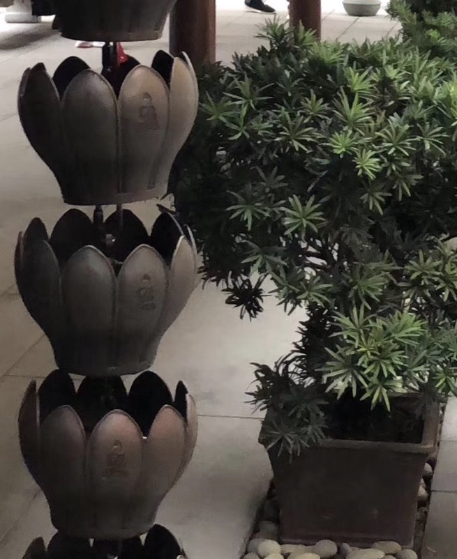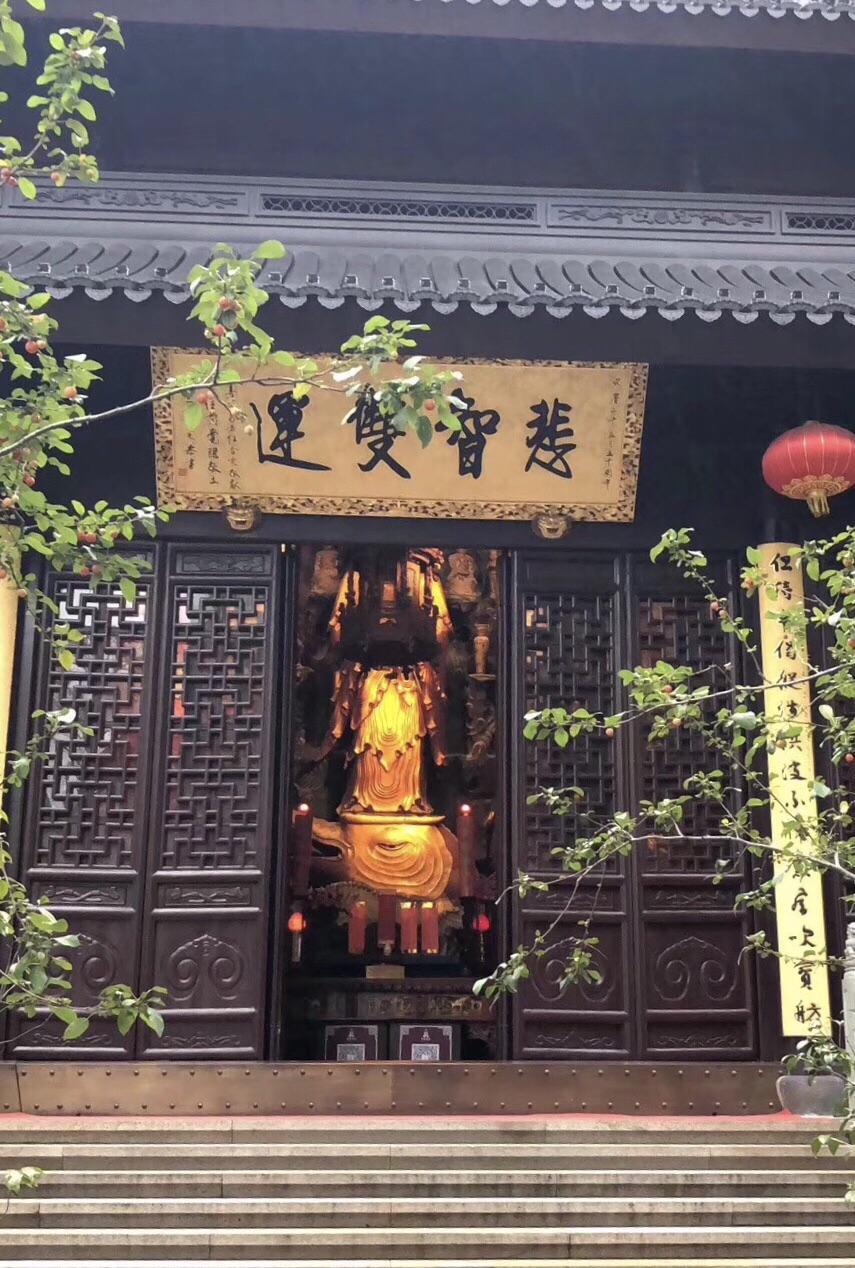 在金碧辉煌的大殿门前,辉印着几个镏金大字“玉佛殿堂”。走进这金碧辉煌的殿堂,就有一尊用玉精心雕刻的栩栩如生的观音佛像,看那观音眼睛炯炯有神地平视前方,面部梢有一丝淡淡的微笑,好象正在看这众生大地,为人们做善事而感到高兴呢!