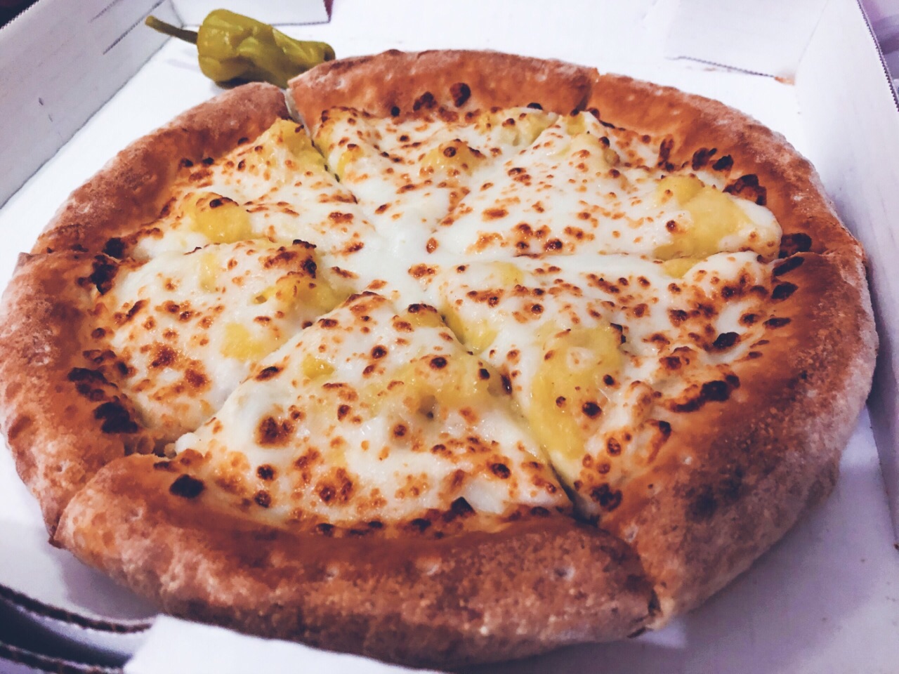 新店刚开不久力度还挺大的 在创客空间 只能走室内 室外的门不开哦 店内不大 堂食桌椅较少 披萨制作过程透明化 点了九寸榴莲披萨 大概十几分钟 默认外带 六块的样子 榴莲果肉还可以 配的酱汁一般吧 喜欢点缀的腌制酸辣椒 棒棒哒[强]