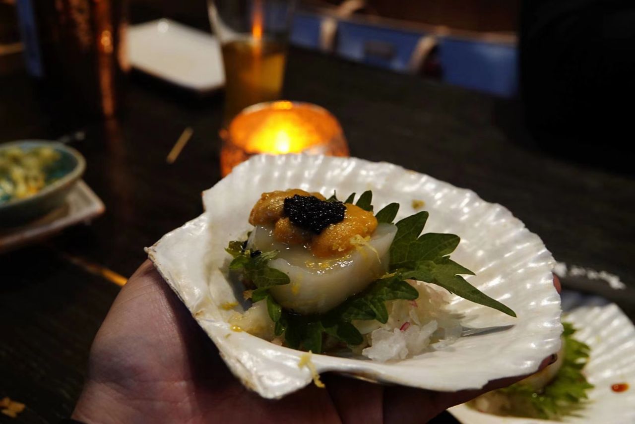 日式烧烤 一个字——贵 俩个字——超值 三个字——真美味 牛外脊,密制三文鱼,牛舌 鸡肝,鸡肉糖心蛋,烤扇贝 无骨鸡脖,鸡翅,精酿啤酒,亲子饭,还有大虾 最最最印象深刻的是鸡肉糖心蛋 我最爱吃的是大虾,鸡翅,以及扇贝 扇贝海胆刺身 海胆绝对不是那种盒装冷冻 超级新鲜好吃 这家店难怪在三里屯寸土寸金 敢白天不营业,不无道理的