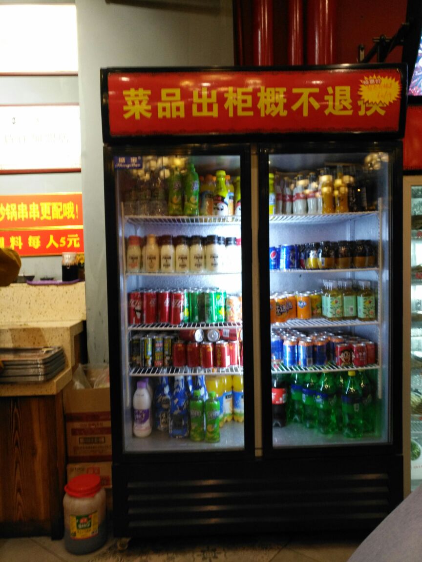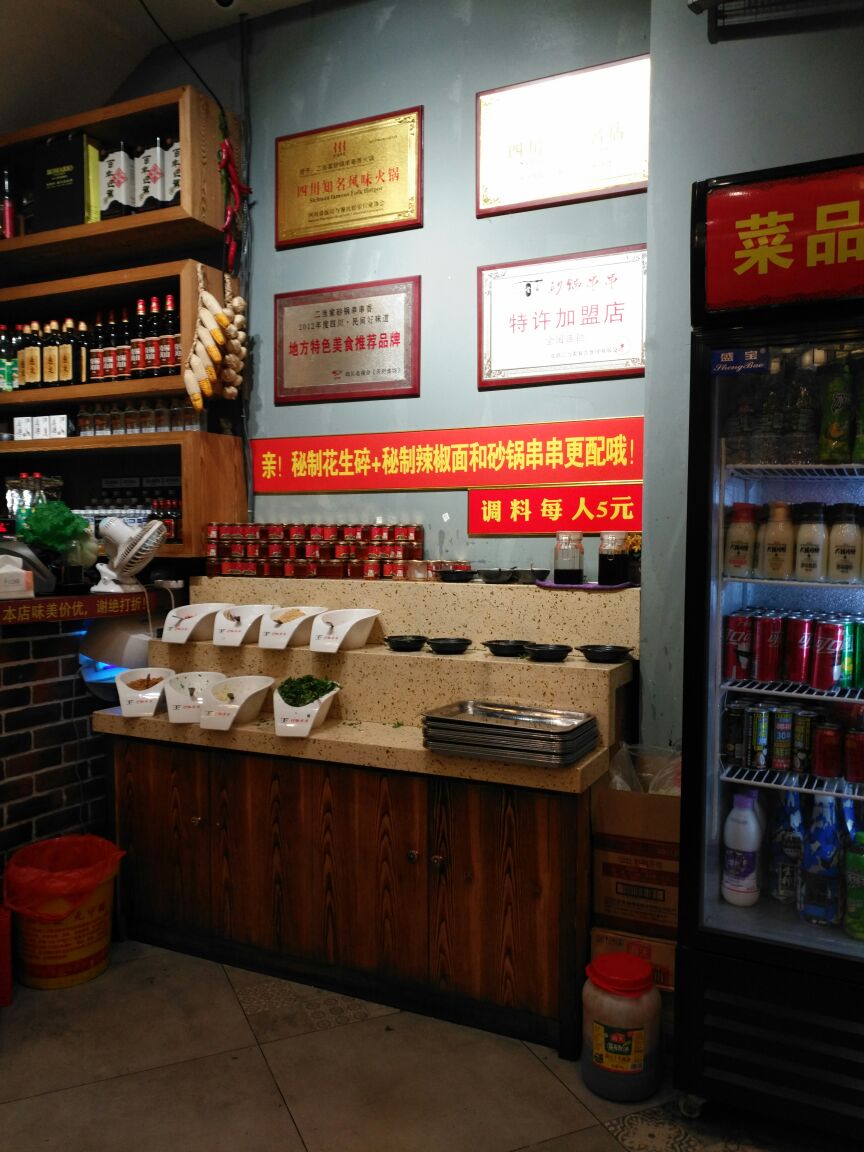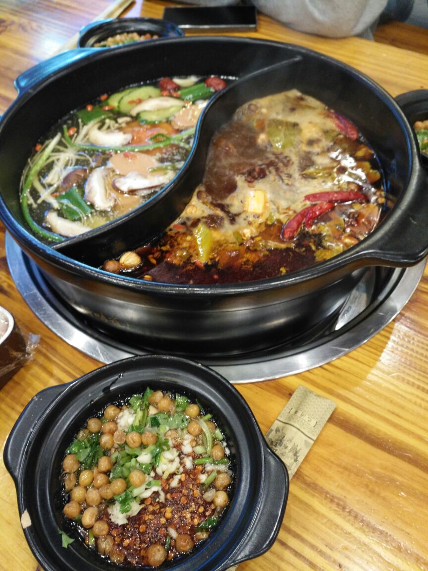 这家店在宝龙的对面。装修的很有特色,墙上很多壁画。我还是第一次吃砂锅串串,一开始有点不知道怎么吃。先从冷柜里挑选自己要吃的菜,每根签的价格都是一样的,蔬菜每个上面有一两根签,荤菜每个上面有三四根签,吃多少拿多少,最后结账的话就是按你吃下来的签总数来算账。我点了一个鸳鸯锅,油碟是老板娘帮我们配好了,配的不错,里面的青豆很好吃。别看好像有的菜上一根签一个菜,但是最后算下来签的总数也是很可观的,价格也很可观,所以吃多少拿多少,不要浪费。这家店生意很好,走的时候满满当当全是人,座无虚席。