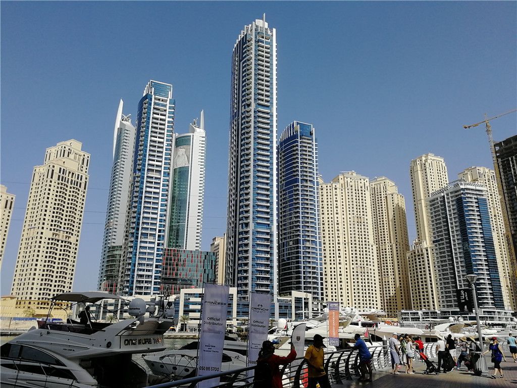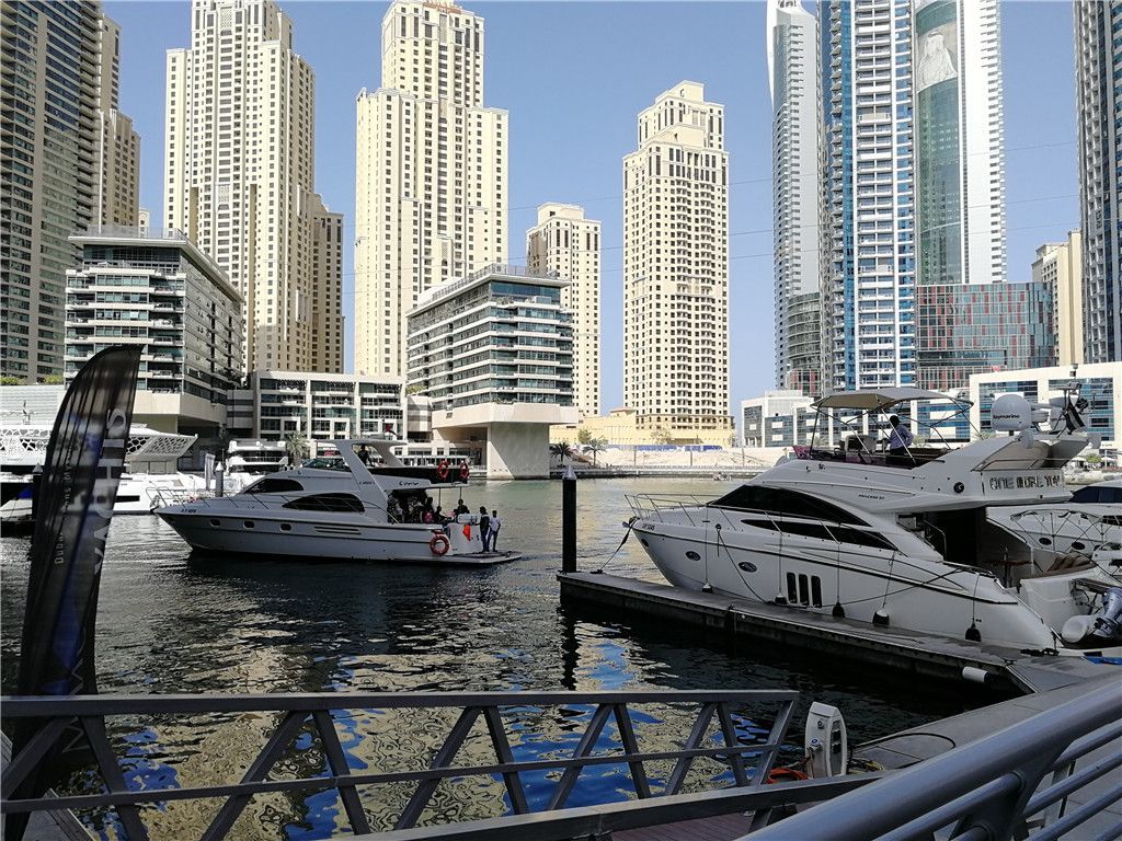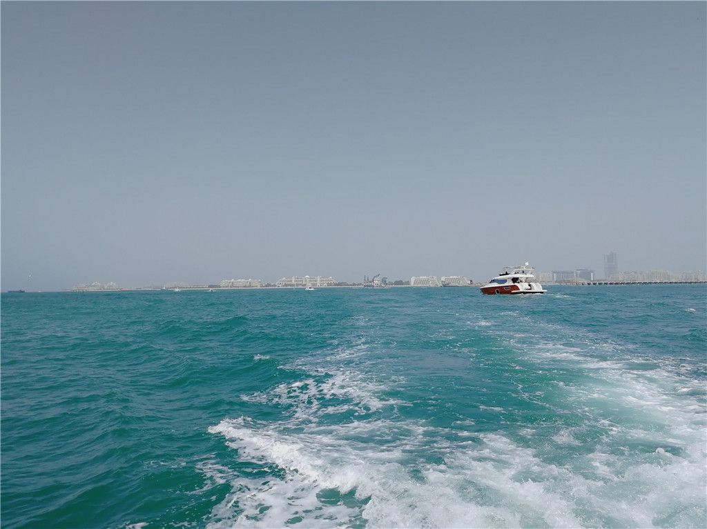 这里离机场、老城、迪拜塔都比较远,游艇码头所在的港湾,周围都是现代化高楼。洁白色的二层高游艇,在阳光照耀下闪闪发亮,旅途很轻松悠闲地出发了。游艇在港内畅游时很平稳,但一出海就显得好颠簸,尤其时去到棕榈岛亚特兰蒂斯酒店外头的海面上才掉头,很多人都受不住晕船了,呆在船舱内也不舒服,还是具一点刺激性的,建议坐在二层通风地方。