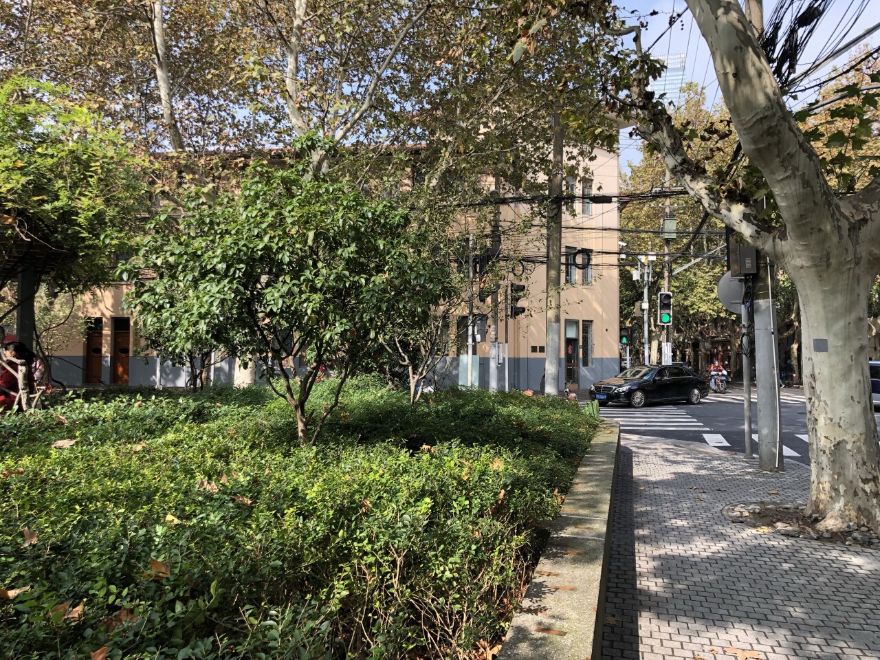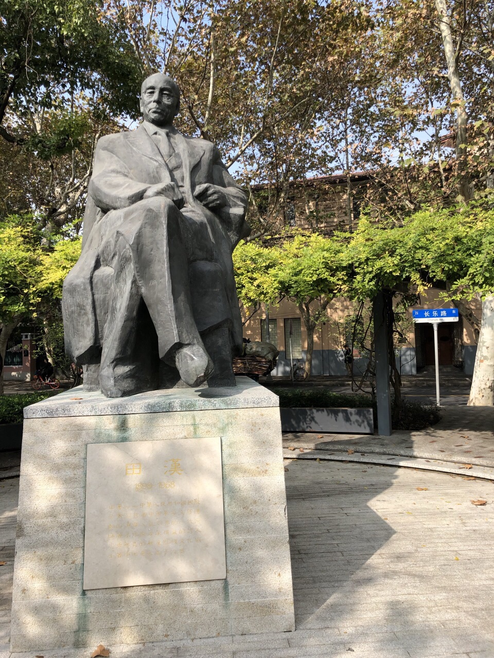 田汉雕像坐落在长乐路富民路口的街心花园中。中午时分过去,煦暖阳光正好洒满田老全身田汉雕像坐落在长乐路富民路口的街心花园中。中午时分过去,煦暖阳光正好洒满田老全身。其慈祥而睿智的目光看着周围的大千世界。 另一侧是东湖路和延庆路。金宇澄所写的小说《繁花》,有一段故事就发生在延庆路上。