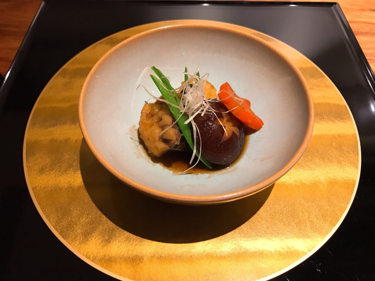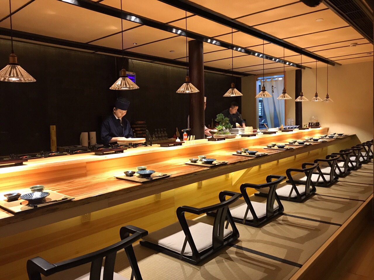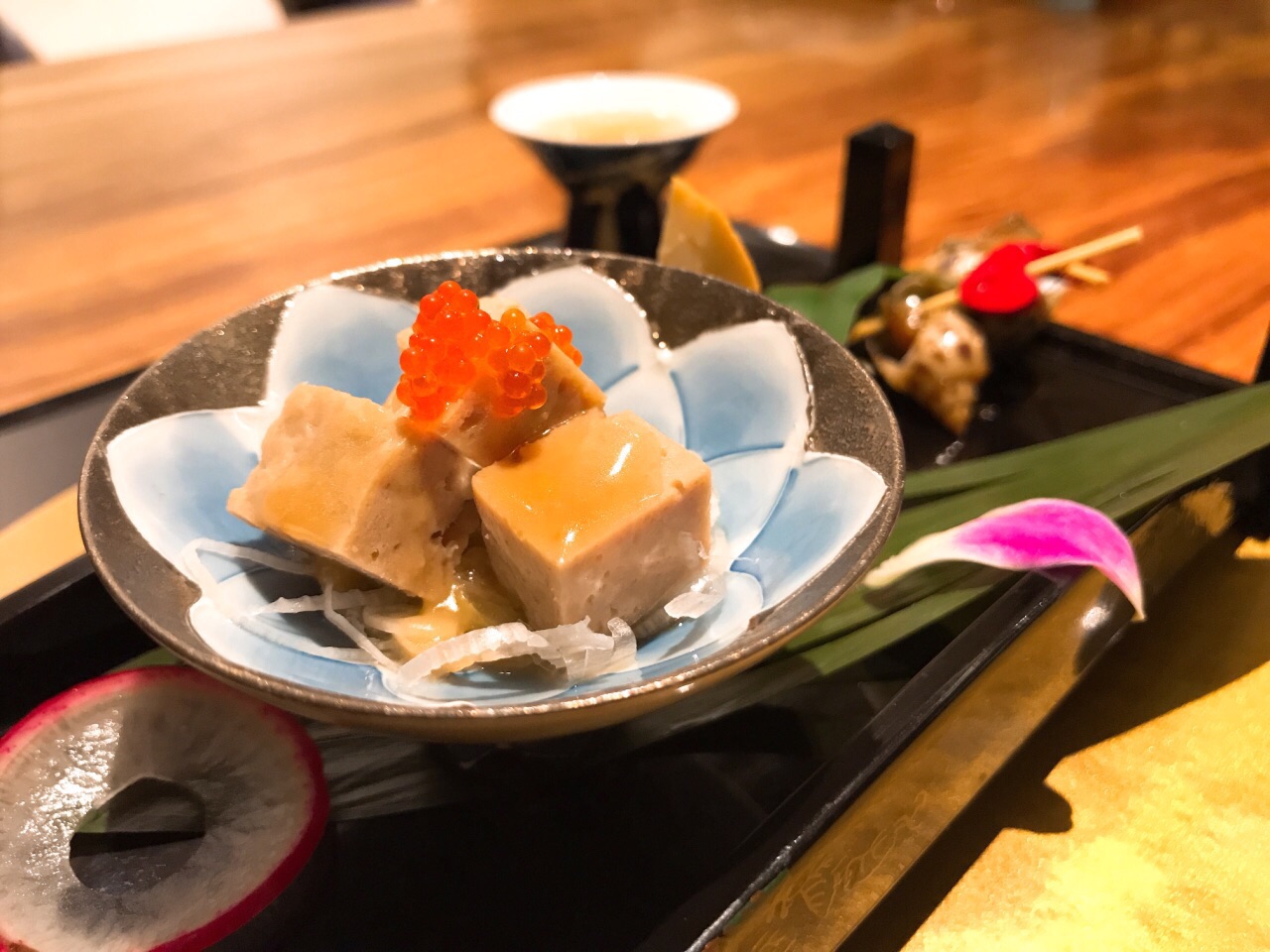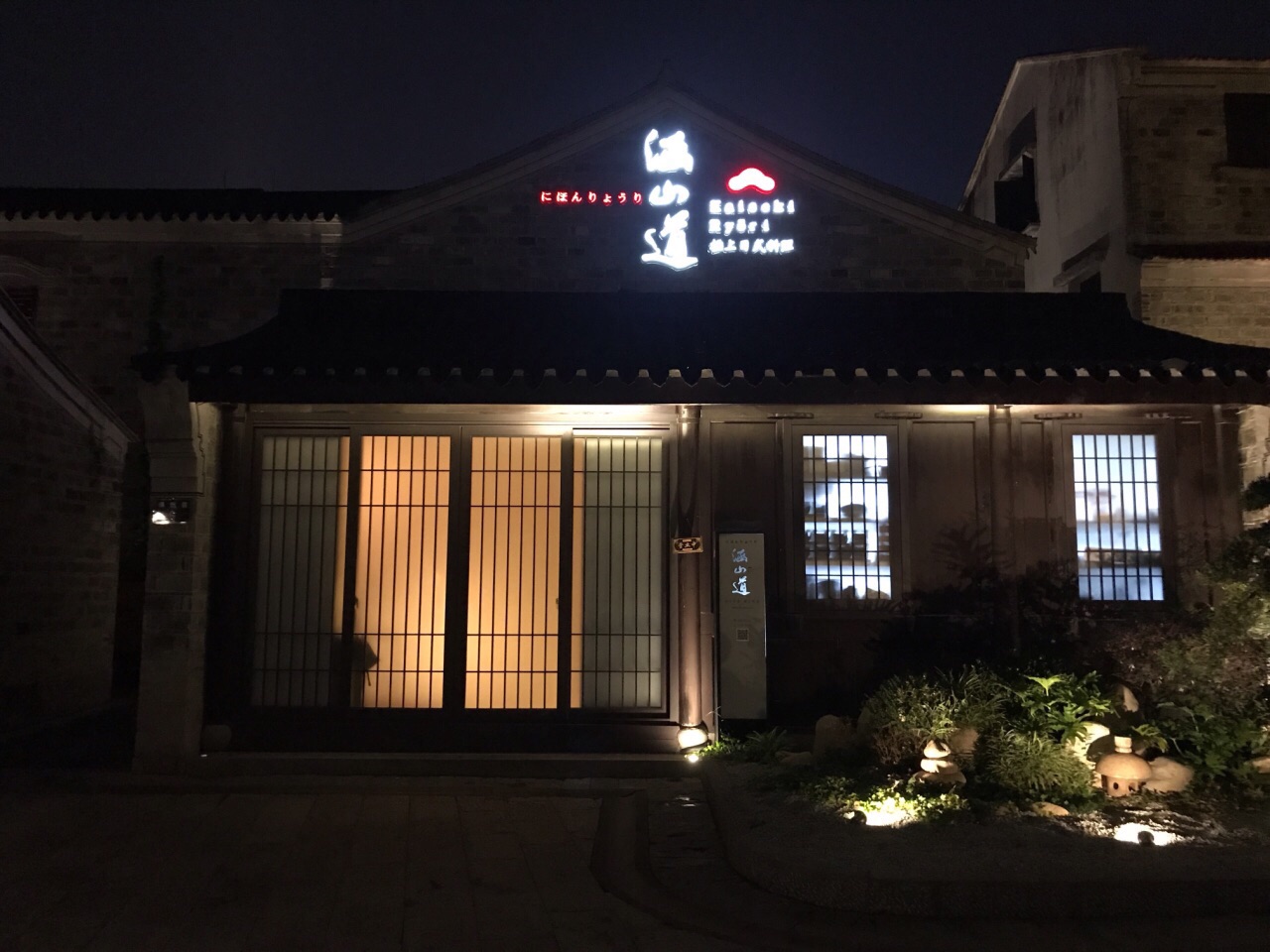 不知该怎样形容涵山道,静立于金汇小镇中,安静而典雅 装修没的说,宁波日料店中数一数二,气质与仿古的小镇很相融 对服务员的培训到位非常难得,日料的礼仪习俗,菜品的简单介绍,这在宁波能做到的店太少了 分套餐和单点,套餐300+和500+两种,单点的菜与套餐不同 前菜:蟹肉鱼糕、南海花螺、黑猪火腿粒 精致的前菜打开味蕾,赏心悦目,微甜梅酒开胃 汤:菌菇莼菜豆腐汤 出汁制成的汤非常鲜美,若咸度稍减更佳,佐以嫩豆腐和莼菜,莼菜本身没有味道,胜在口感圆融、鲜美滑嫩 刺身三品:金枪鱼、大竹荚鱼、帝王鲑三文鱼 应季而食,也是日料宗旨之一,竹筴鱼正当季,金枪鱼中脂质感,三文鱼肥美 煮物:红烧真鲷鱼 鲷鱼煮的真是好吃,鱼肉块厚,但煮入味,连配菜都很赞,香菇吸汁,融合菌菇和鱼的鲜味 天妇罗:牛蒡带鱼天妇罗 天妇罗有巧思,带鱼裹牛蒡,面衣还不错的,除了控油稍稍欠些,总体算是蛮不错的,毕竟天妇罗这东西国内也做不好 沙拉:蔬菜沙拉 比较平常,放一张图秀一下非常好看的碗 和牛:骰子牛肉 油脂丰厚的和牛粒,超赞,如果单点菜单有这道,绝对推荐 寿司三贯:黄鲥鱼、甜虾、玉子烧 寿司并不佳,并非寿司专门店,所以也不必要求太高,其实可以试试换成散寿司饭,难度降低一些,三四郎玉子烧有点小惊艳,一口咬下两种口感,很赞 甜品 常规的抹茶布丁,有点小,味道较淡,抹茶的清苦香味稍不足 器皿相当精致,环境雅致,服务周到,仍然有许多亮点