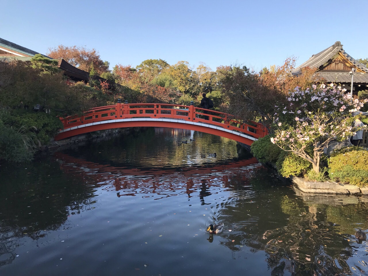 神泉苑离二条城不远,是一处路边的小花园。池水那边有几幢红色的建筑为景点增添了几分浪漫神泉苑离二条城不远,是一处路边的小花园。中间一小池水、水中及池边有各种野生水鸟栖息,悠哉悠哉。池水那边有几幢红色的建筑为景点增添了几分浪漫。