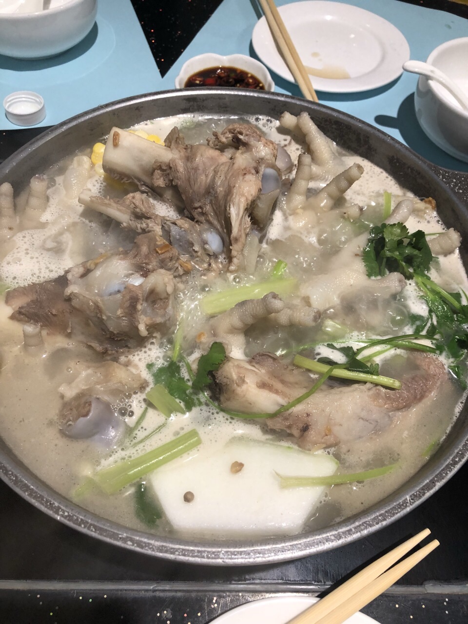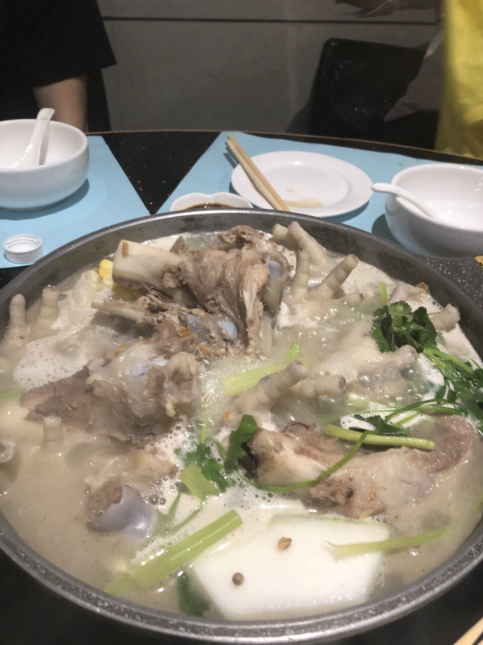 之前怎么没注意过有这样一家火锅店呢。一看营业时间,那怪不得了,都是晚上开。南方的特色,骨头鸡脚一起炖,然后涮菜涮肉的。茼蒿不错,挺新鲜,整体感觉就缺了口儿芝麻酱的香浓。第一次吃鳝鱼煲仔饭,肉质还挺入味的,就是感觉有点儿腻。