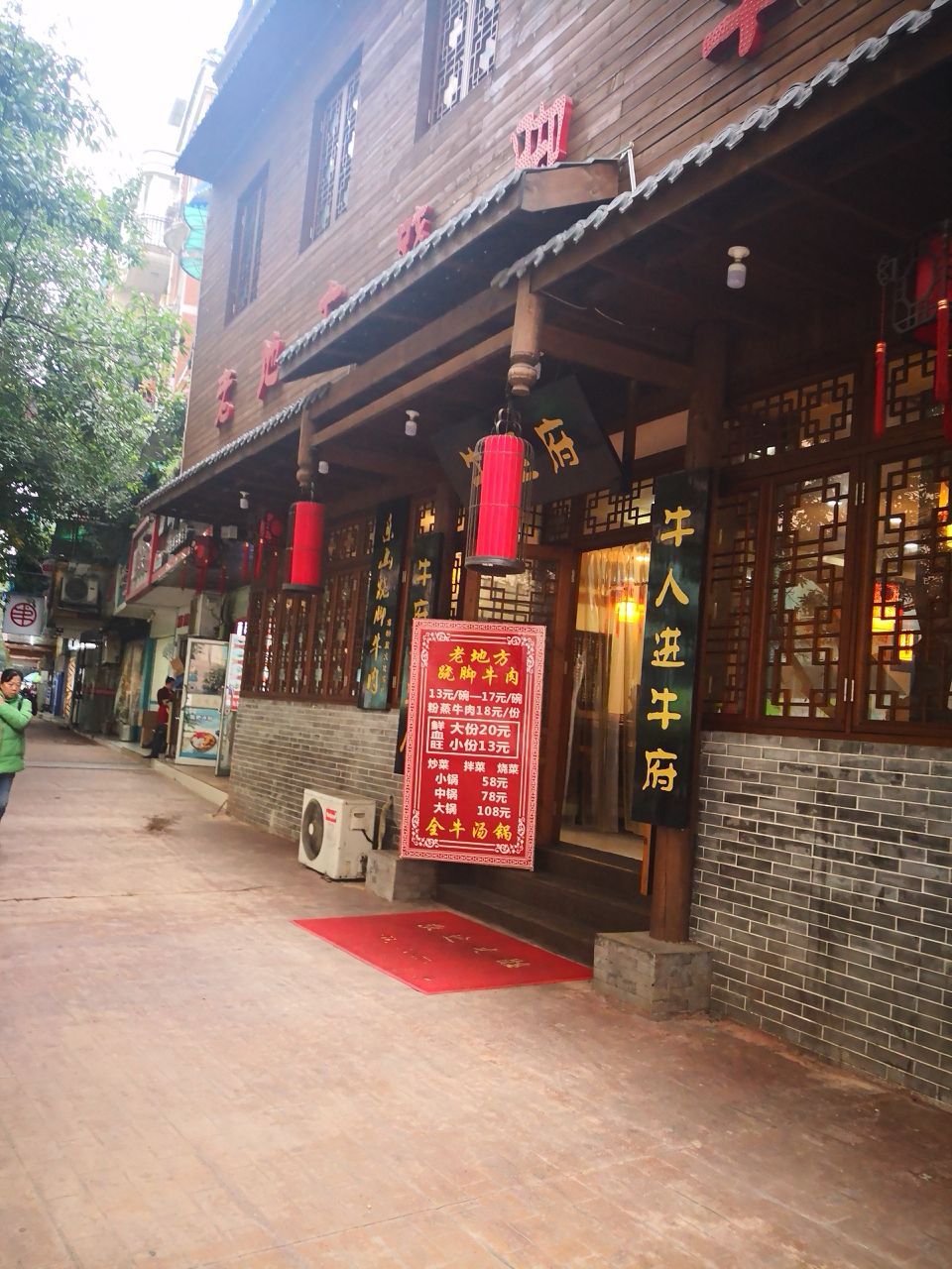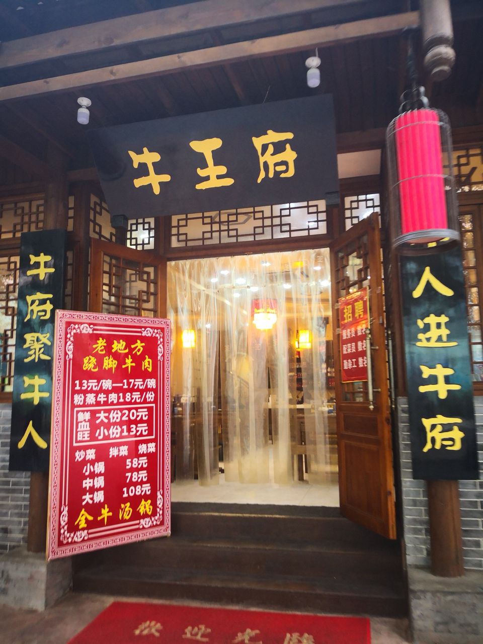 下了公交车,走到家乐福门口直接右转,步行几百米就到,店很好找,古香古色的装修。抬头一见牛王府,那我们就府上一走。 套餐里面有一份血,一份牛肝,一个汤锅,两份米饭,原价112,五折56,每人28 血和平时我们吃的血不一样,上面还加了一点肉臊子,汤汁里面有卤水的味道,血吸收了汤汁的卤味,特别的好吃,最近吃血好,雾霾天清肺,拿来拌饭,咳咳,我吃了两碗。 牛肝,端上来就有胃口,超级下饭哦,我又一不小心吃了一碗米饭。 一直忽略了老板送的泡菜,想起来捻了一根,有点回甜,加了红油更香,再来半碗米饭 汤锅端上来,里面有牛肉,牛杂,白菜,牛肉和牛杂搭配干碟子,这个干碟子不太辣,有盐味,很香,牛肉蘸着吃很巴适,不好意思米饭没有了。 味道确实很不错,怪不得中午店内就坐满了,还看到有翻台的。