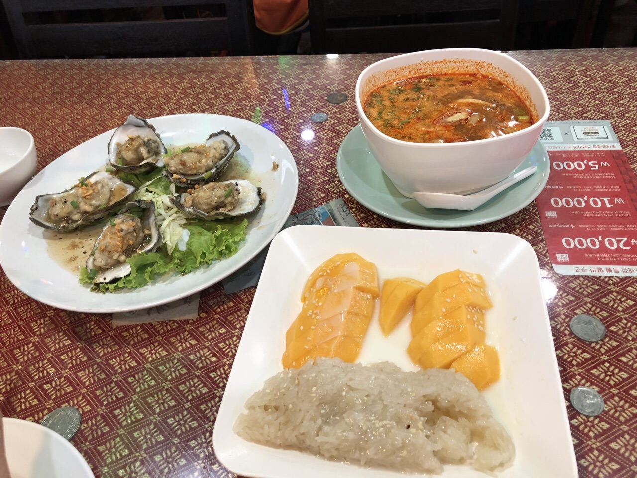 还真不错的,推荐。点了普通龙虾,生蚝,冬阴功汤,芒果糯米饭,还有炒通菜点了普通龙虾,生蚝,冬阴功汤,芒果糯米饭,还有炒通菜。海鲜可以砍价,味道都很不错,可能口味不一样吧,看网评很多说糯米饭好开胃,我和男票都觉得甜了点,冬阴功汤很下饭。还真不错的,推荐