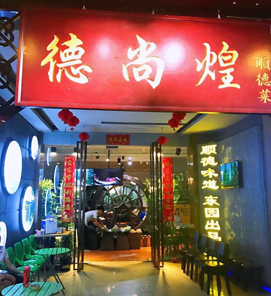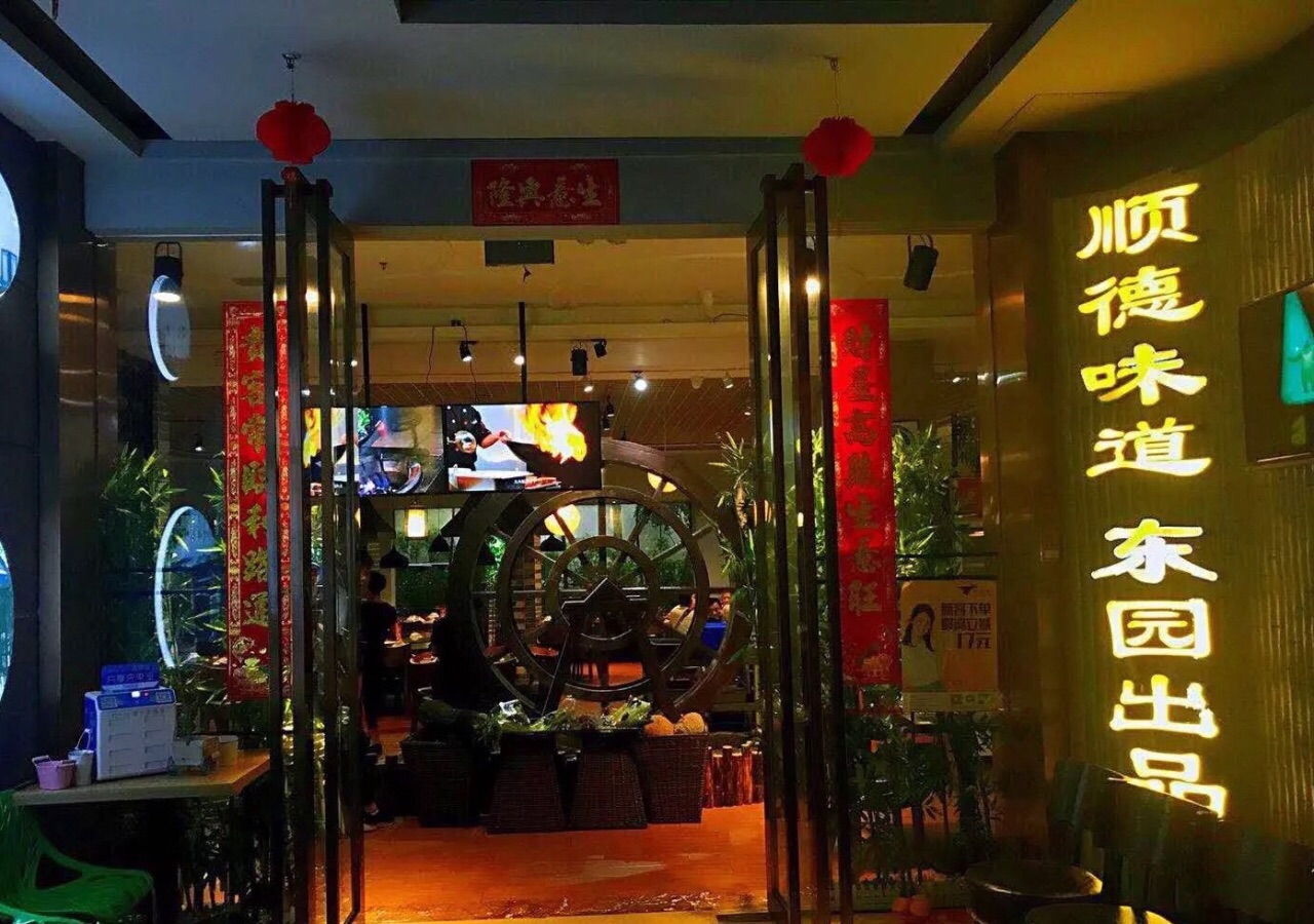 德尚煌.六艺领鲜顺德菜(四季天地店)位于赤岗北路118号四季天地首层,虽然附近有地铁三号线广州塔站和公交车赤岗路口站,但是也要步行十几分钟,交通不算方便。 朋友中了德尚煌.六艺领鲜顺德菜(四季天地店)的三人霸王餐,约我晚上过去消费。 这家的门面较大气,门前的LED反复在播放连山食品供应基地的录像片。一进餐厅门口,就见到了一部小型的水车,水车旁还展示了很多新鲜瓜果蔬菜等。店面装修的很有特色,突出了顺德特色。 【盐炊连山土鸡】鸡不很大只,鸡肉结实,鸡味浓郁。 【清炒连山菜心】菜心很嫩,非常清甜。 【顺德鱼塘公焖鱼】鱼很大条,先煎后焖,非常鲜甜。汤汁拿来捞饭正好。