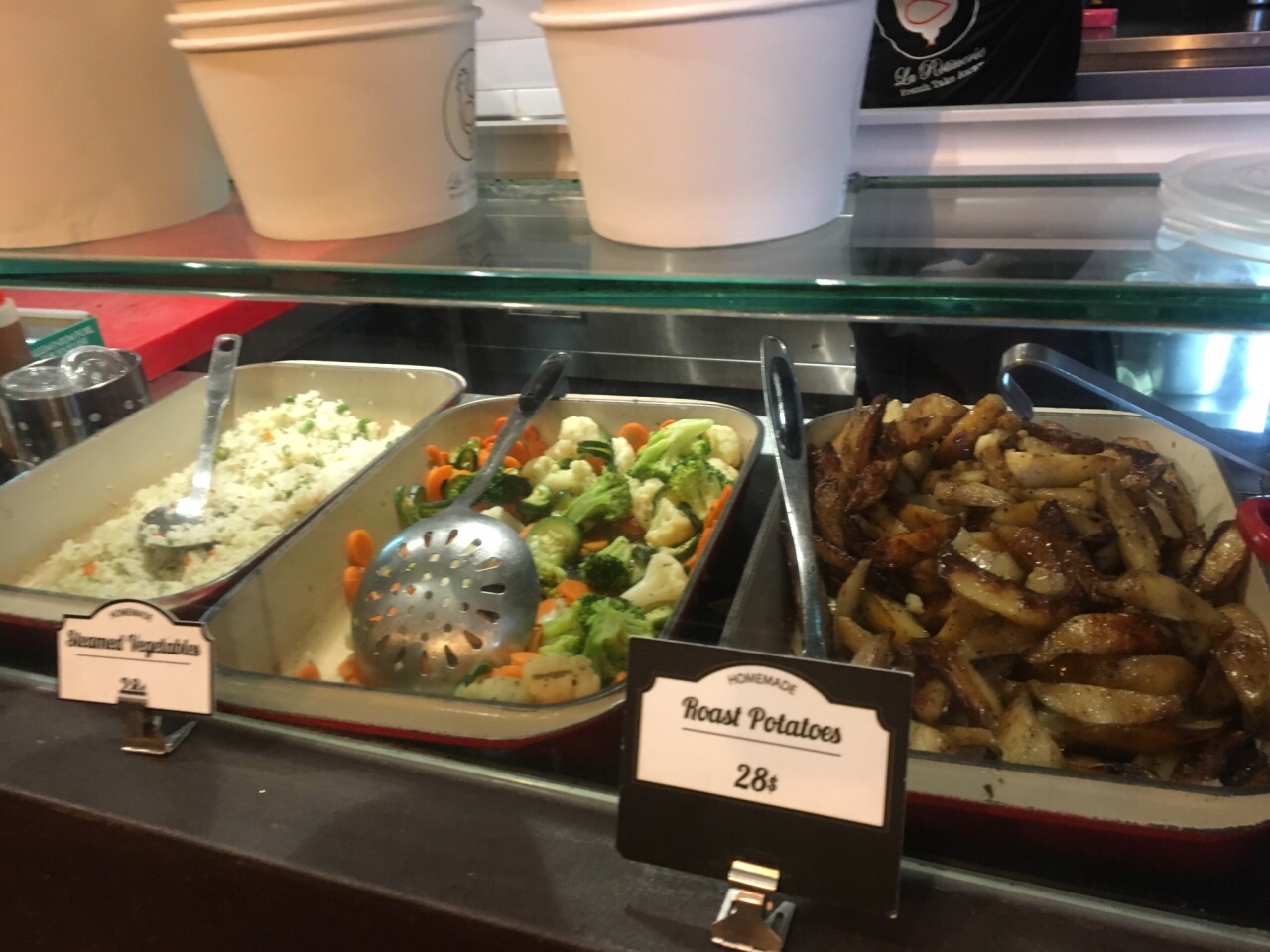 来光顾这家餐厅的多半都是老外,因为它本来就是一家法式的餐厅,以烤鸡为主。餐厅里面座位很少,基本上都是高脚凳,然后靠墙有一排桌子,大部分的人都是打包带走的。烤鸡以1/4只或者半只或者一只来售卖,1/4的话可以选择鸡的上半身或者是下半身。配菜主要就是炸薯角和西兰花、花椰菜和胡萝卜。炸鸡最好是现烤现吃的时候是最香的,皮是非常的好吃,不过里面的鸡肉就稍微太饲料鸡的感觉。