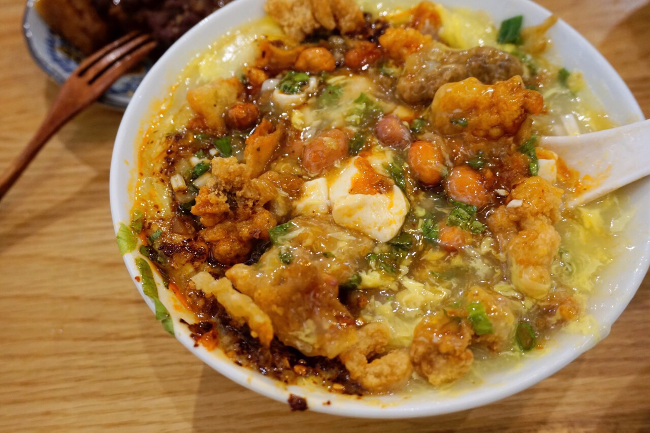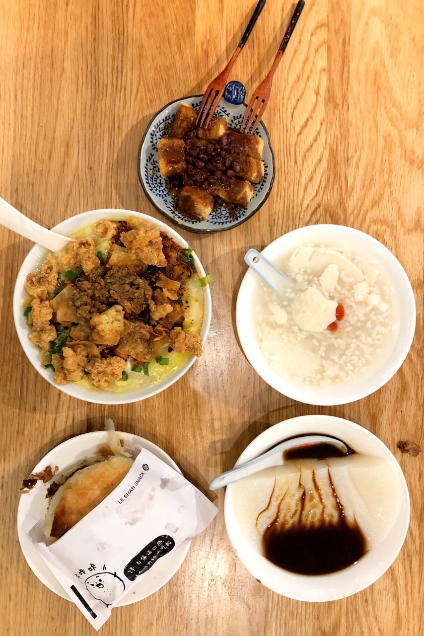一直收藏的一家小店,虽然很“网红”范儿,但真没有把乐山传统美食毁掉哦!(为什么这样说,因为定义为网红店在我的印象中大都是中看不中吃)这家还是用了心的,东西实实在在。 小吃作为我们的晚餐,选了几样感兴趣的东西。 【蛋冲牛肉豆腐脑】12,+酥肉3。蛋冲就是在豆腐脑原有的基础上加了鸡蛋,直接打进去冲就有点蛋花儿的样式。牛肉是粉蒸牛肉吃起来蛮香的,酥肉确实吃不出来肉感,但是脆脆的还是和豆腐脑很搭。这碗铺满了的浇头看着就很诱人,而且确实也很好吃。 【卤肉咔饼】10,我一直以为咔饼的外层就是白面锅盔,而这里是酥脆得饼皮,一口一咔嚓,资格的“咔”饼,哈哈。卤肉切得很碎,而且夹的肉肉很多很饱满,瘦肉比肥肉多,卤香浓郁,是我喜欢的类型。 【冰醉豆花】7,醪糟确实很香浓哦,甜度恰到好处,就是感觉豆花儿少了点。 【手工凉糕】7,确实跟我们这边的凉糕大不同,就完全是米做的没有加乱七八糟的东西,没有碱味儿。口感又软又糯,入口即化,红糖浓成酱酱。这样的搭配就非常美味了。 【糍粑小方】原价6,那天搞活动半价3。这个是网友推荐,但确实比较失望了。加了红豆红糖,糍粑本身偏干偏硬。 买单的时候小妹儿问我加不加青,然后我反问什么是“青”,然后我才晓得原来这边说的“青”其实就是“葱”。要青要青,但是不要香菜。小妹儿说他们这没有香菜。耶!