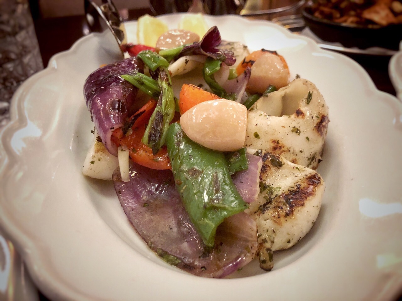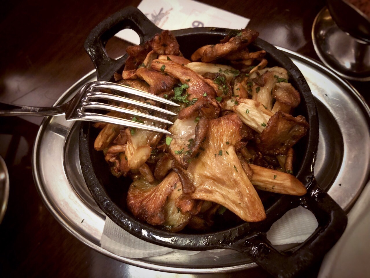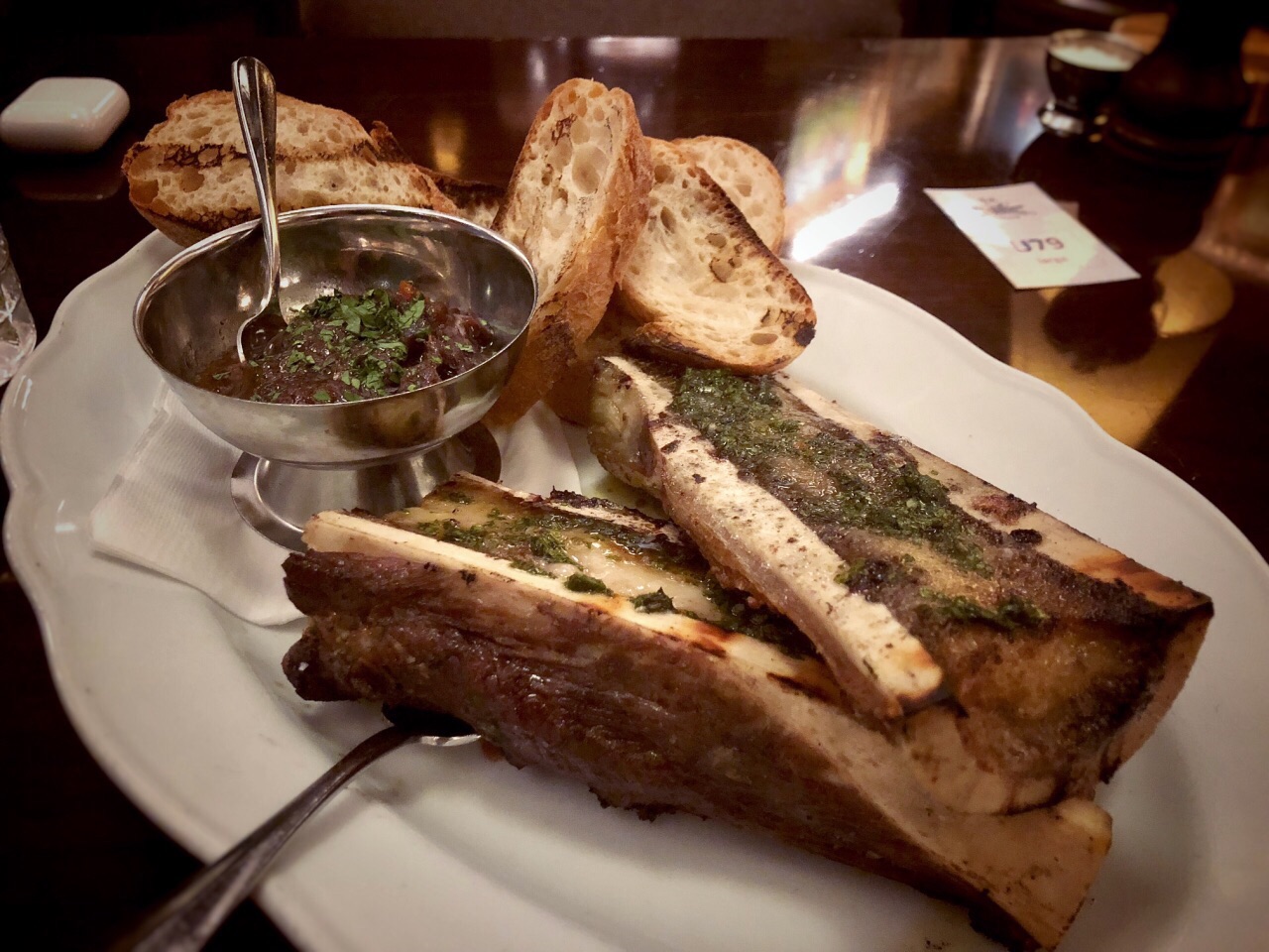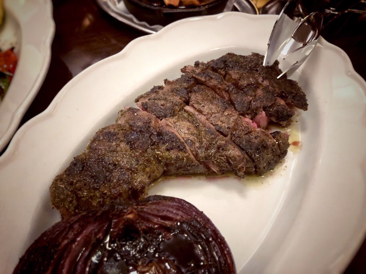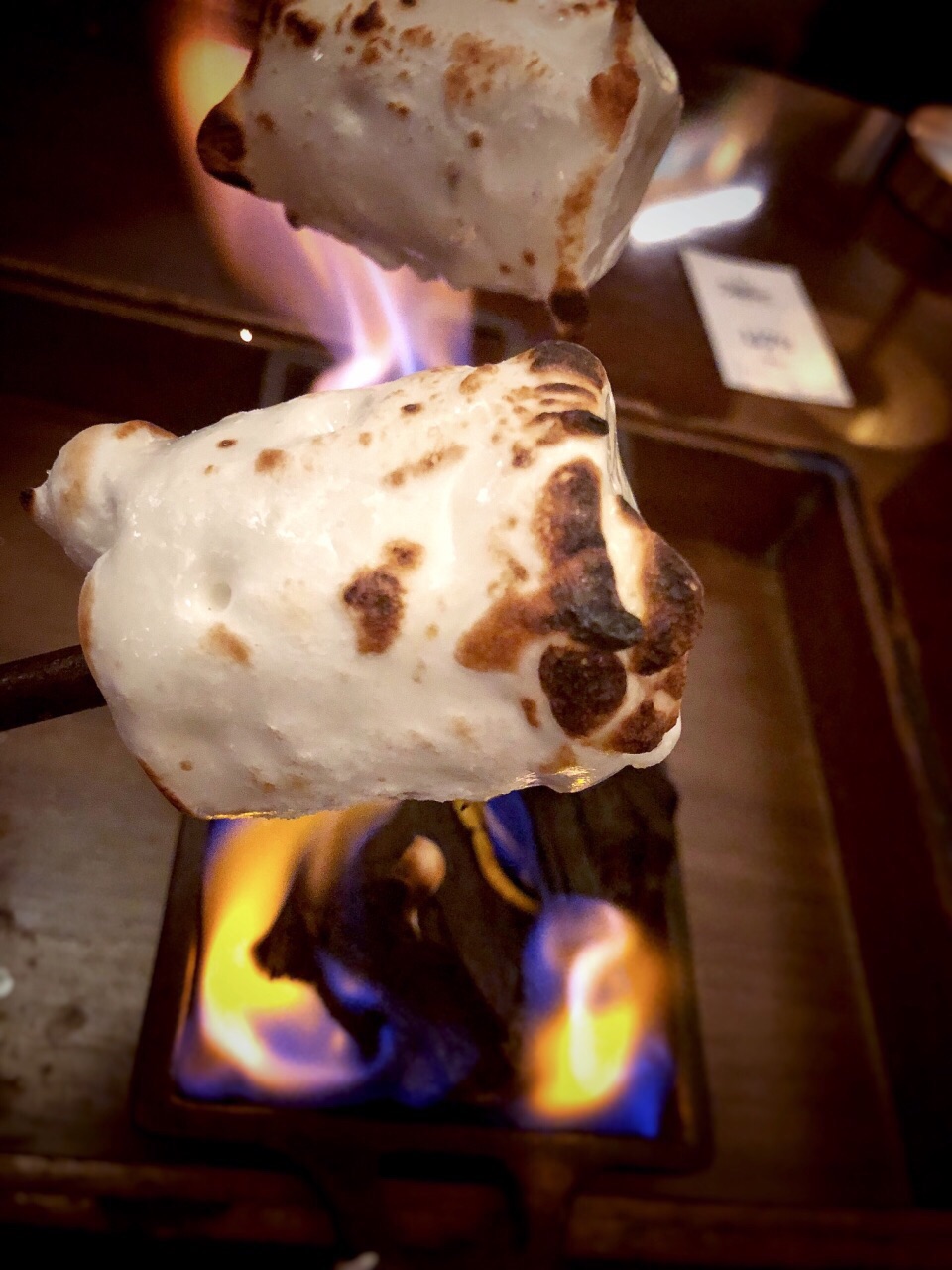 Black sheep 餐饮旗下的餐厅,期待很高,不由自主的拿Carbone去对比。 头盘的骨髓无功无过,搭配的梅子酱贴心又解腻。 Ribeye牛排,筋比较多,也是无功无过,主动附上几种酱汁是贴心之举。 烤鱿鱼,肉质鲜嫩,味道略显单薄,不过配上盐也是一道不错的菜。 side dish蘑菇个人认为烧的干扁了些。 要说特色确实是这道棉花糖甜点,炭火小火炉端到台面上,棉花糖里裹着巧克力冰淇淋,一冷一热,一柔软一爽口,吃得好不欢心。 整体体验确实和carbone还有差距,不少菜都找不到回头的理由,唯有一道甜点回忆良久。