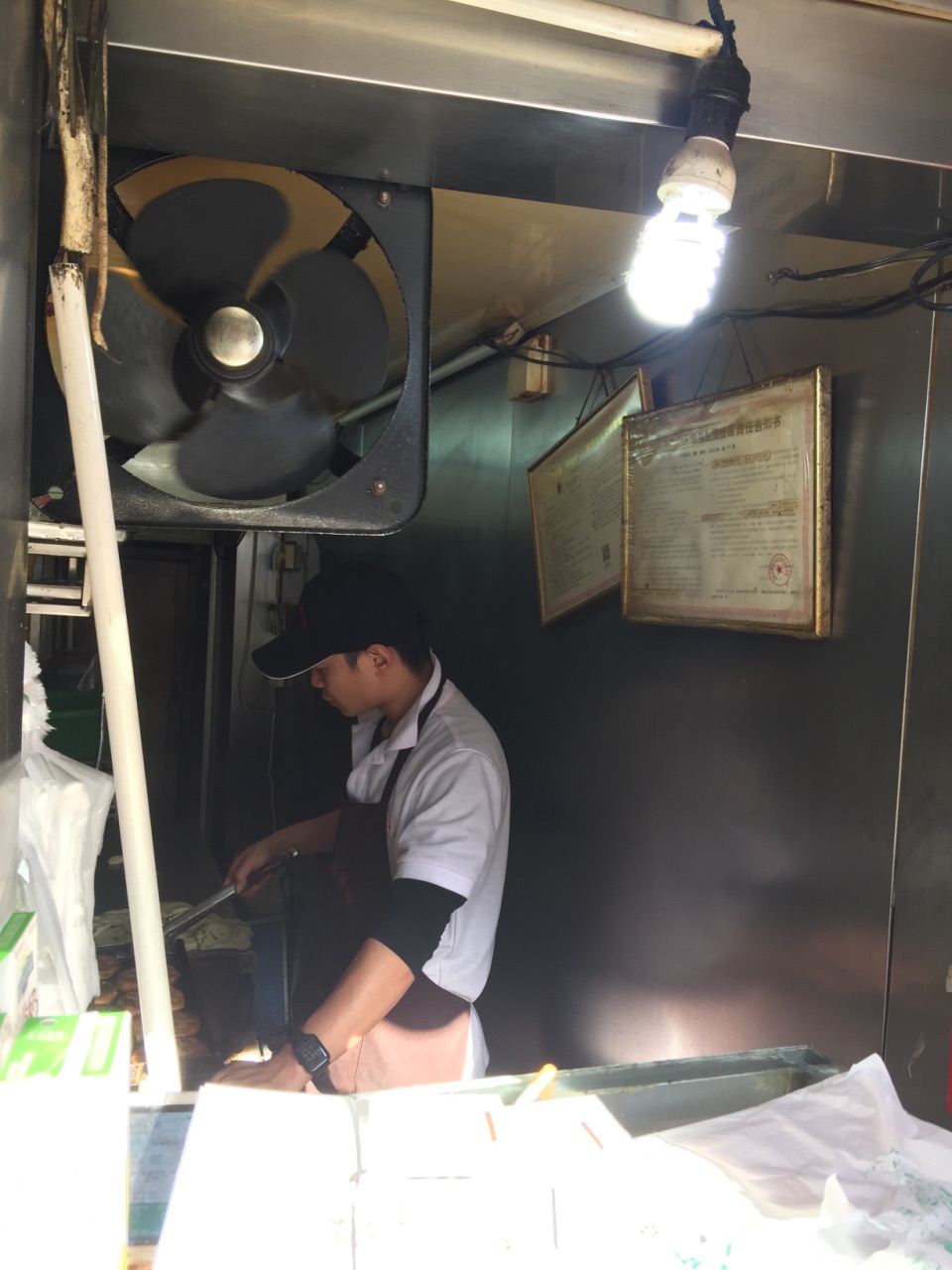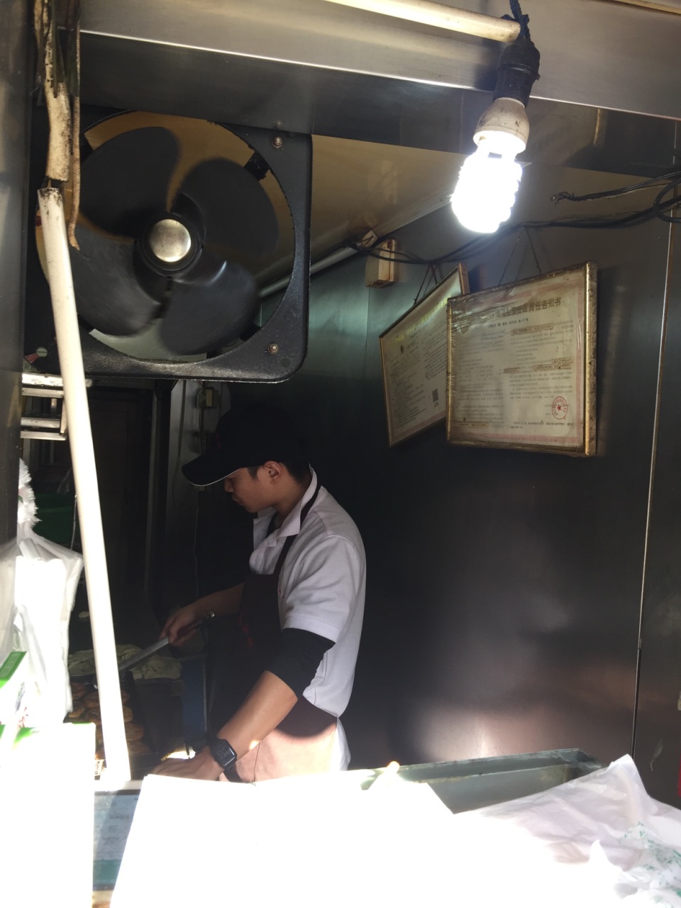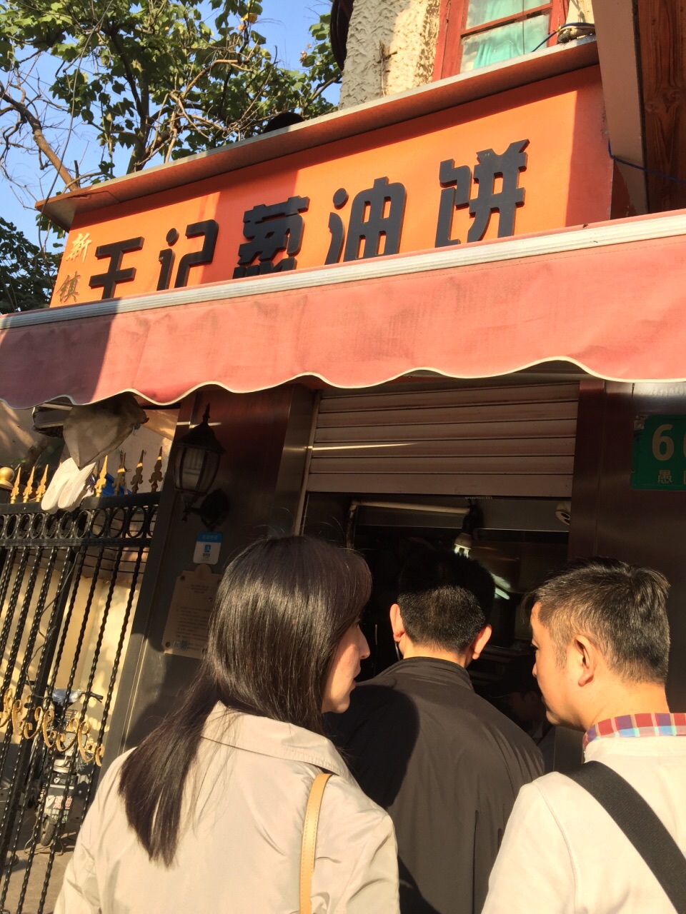 路人的葱油饼闻着没啥葱油饼应有的香味。到店还是没啥香味。没啥人排队,我前面就两对,好像都是路过的