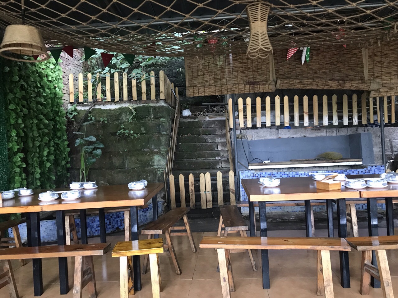 二樓的大廳雖然私密性不好, 但相比三樓狹窄的包房, 空氣和視野反而更好, 半戶外的環境也天然...