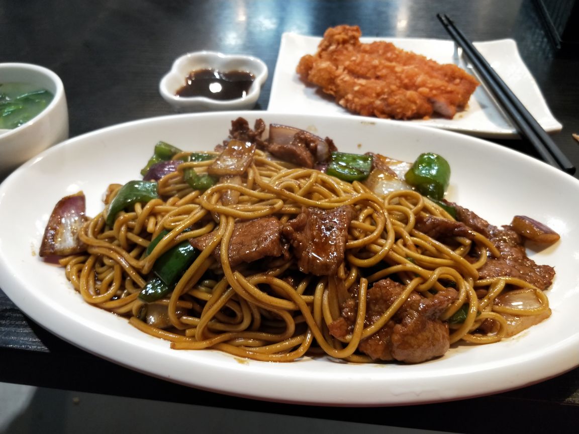 在东江湾路办完事,打开手机软件搜寻附近美食,本来想去万寿斋的,没想到这家店的人气这么高,就骑了辆摩拜过去。 已经过了一点,没想到还有这么多人,点了它推荐的咸蛋黄炸猪排,还有一份蚝油牛肉炒面。 先说炸猪排,份量足够,价格也不高,口感还算比较嫩,肉里还夹杂了几块碎骨,咸蛋黄的咸鲜是一点没有体现出来。 炒面用的是粗面,牛肉不少,看上去很油,吃上去却不觉得油腻。