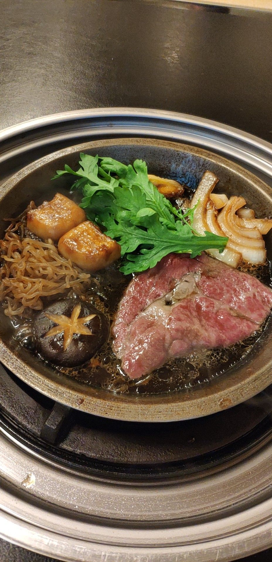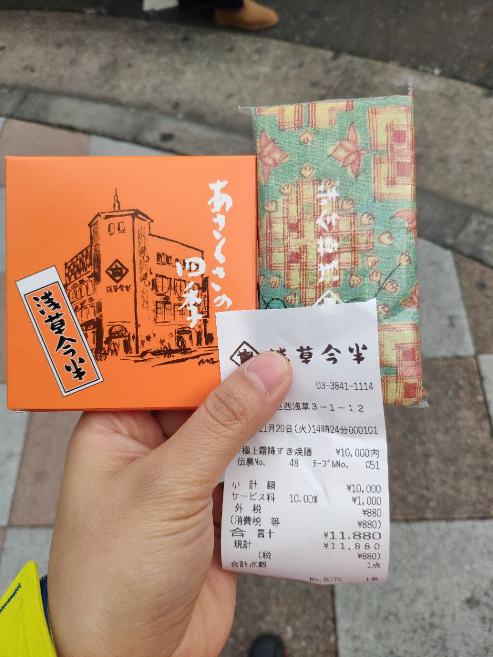 点的极品雪花肉寿喜烧御膳,10000日元,加税结账是11880日元,折合人民币730元。牛肉入口即化,好嫩好滑好美味。是日式榻榻米,盘腿坐,也可以要个小凳子,前菜也好好吃,这次一人自由行最满意的一餐。结账出来给的纪念品。